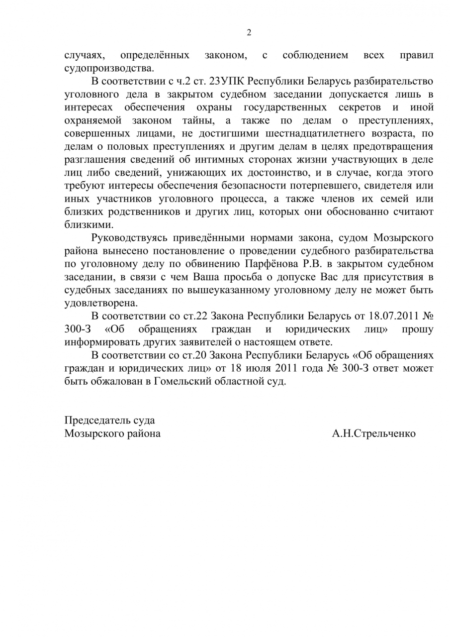 Просьба о допуске заявителей для присутствия в судебных заседаниях по уголовному делу по обвинению Парфёнова Р.В. не может быть удовлетворена.