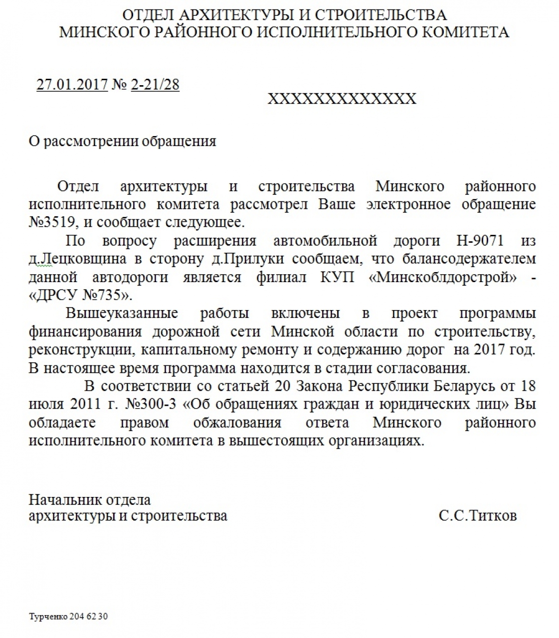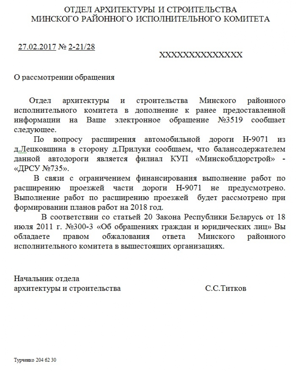 На участке дороги от д. Лецковщина в направлении аг. Прилуки проезжая часть автодороги имеет всего одну полосу для движения автомобилей в обоих направлениях. Такая схема движения автотранспорта является небезопасной для её участников. Для того, чтобы разъехаться, автомобилям, движущимся в противоположных направлениях, нужно съезжать на обочину. Данный участок дороги становится всё более и более нагруженным, так как в аг. Прилуки развернута масштабная стройка жилого квартала, и жители активно используют эту дорогу. Просьба решить вопрос с расширением этого участка дороги и обезопасить передвижение автотранспорта по ней.