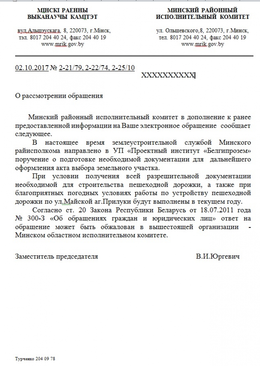 При условии получения всей разрешительной документации необходимой для строительства пешеходной дорожки, а также при благоприятных погодных условиях работы по устройству пешеходной дорожки по ул.Майской аг.Прилуки будут выполнены в текущем году.