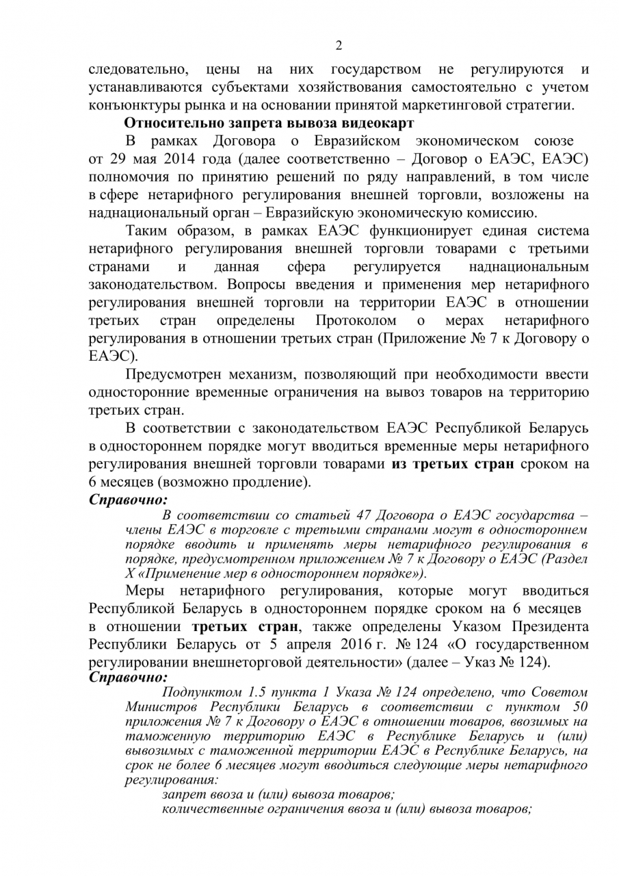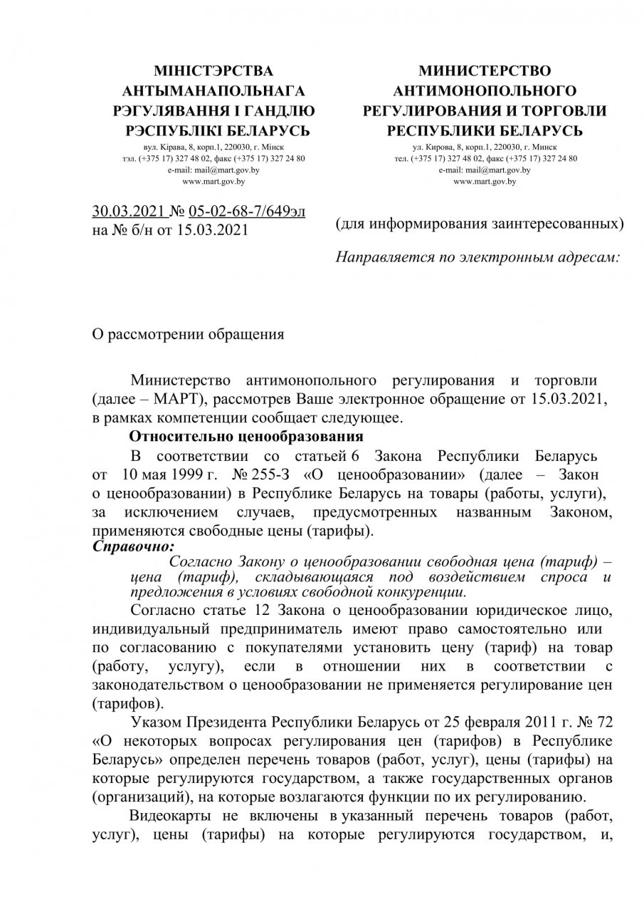 Видеокарты не включены в перечень товаров, цены (тарифы) на которые регулируются государством, и, следовательно, цены на них устанавливаются субъектами хозяйствования самостоятельно с учётом конъюнктуры рынка и на основании принятой маркетинговой стратегии.