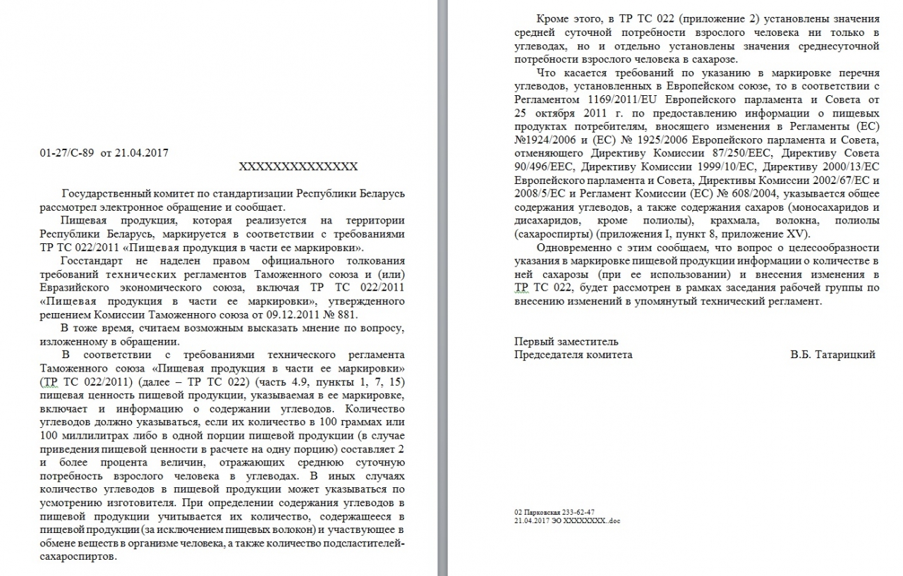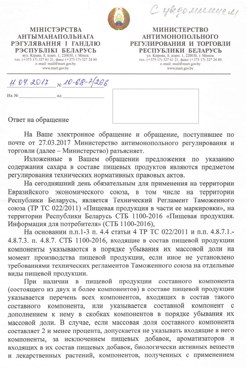 Вопрос о целесообразности указания в маркировке пищевой продукции информации о количестве в ней сахарозы (при ее использовании) и внесения изменения в