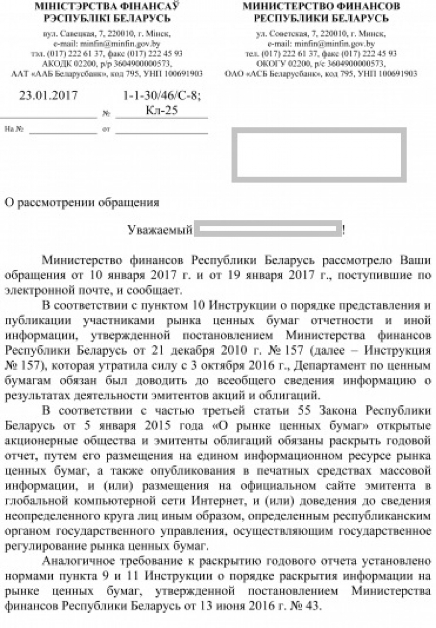 Требуем возобновить публикацию итогов деятельности ОАО и эмитентов облигаций, которые размещались по истечению каждого квартала на сайте Министерства финансов либо другом общедоступном портале, обязать Департамент по ценным бумагам Министерства финансов публиковать ежеквартальные и ежегодные отчеты ОАО и эмитентов облигаций и принять другие меры по обеспечению открытости и публичности на белорусском фондовом рынке.