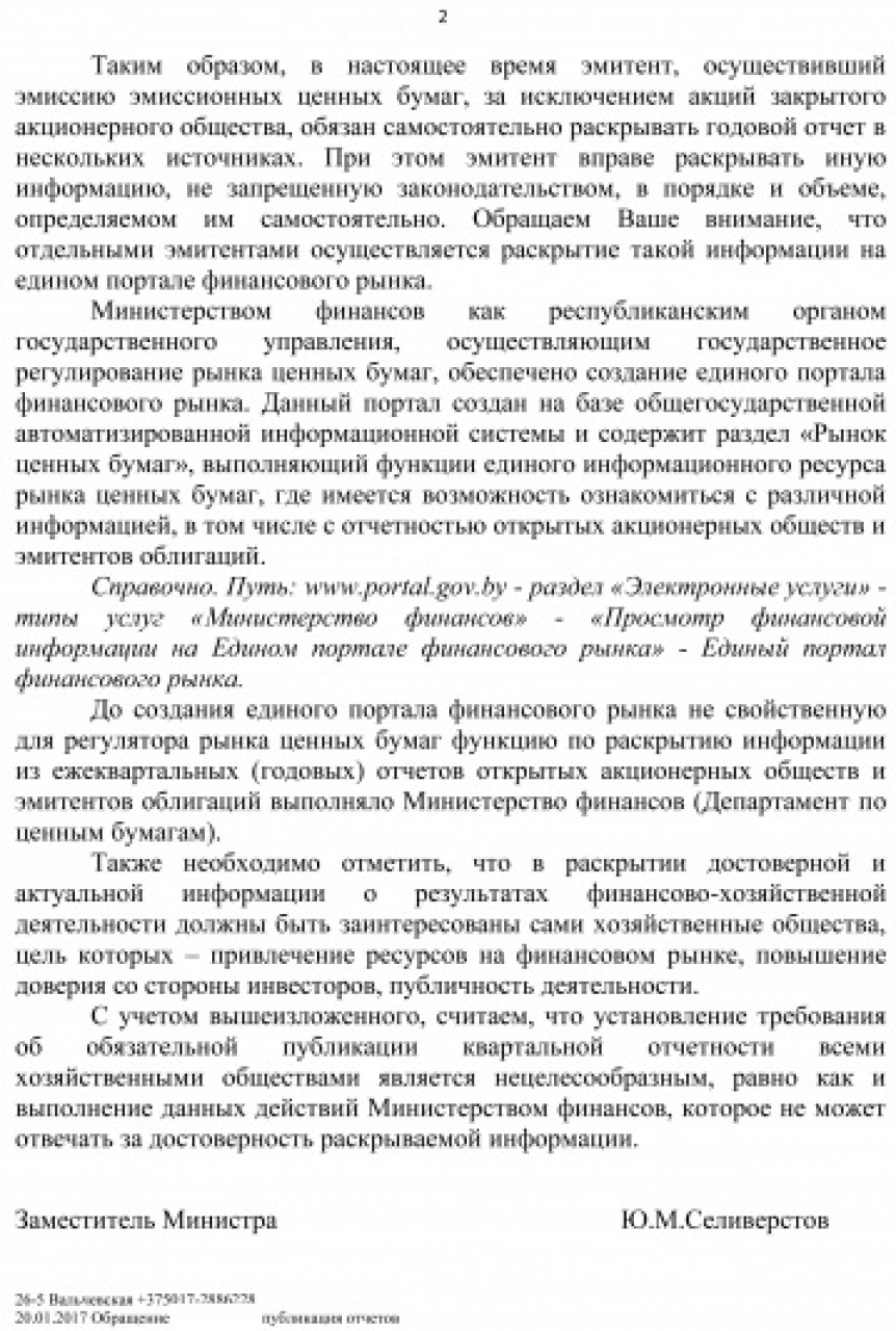 Однако в конце декабря 2016 года очередная публикация итогов деятельности эмитентов ценных бумаг не состоялась. Отсутствие данной информации несет угрозу дальнейшему развитию финансового рынка Беларуси, поскольку фактически не дает возможности инвесторам выбирать, куда вкладывать ресурсы, анализировать риски и прогнозировать доходность инвестиций.