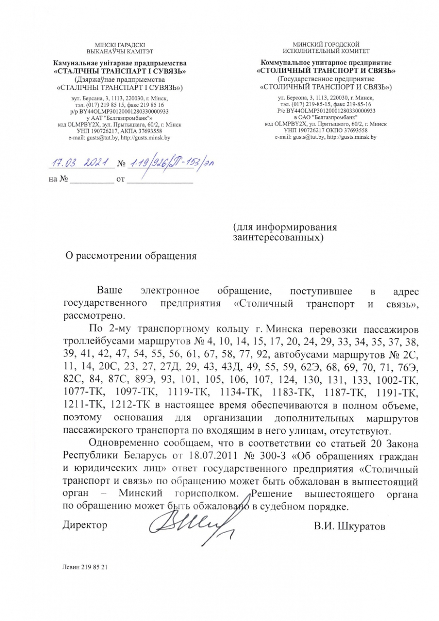 Основания для организации дополнительных маршрутов пассажирского транспорта для перевозки пассажиров по 2-му транспортному кольцу г.Минска отсутствуют.