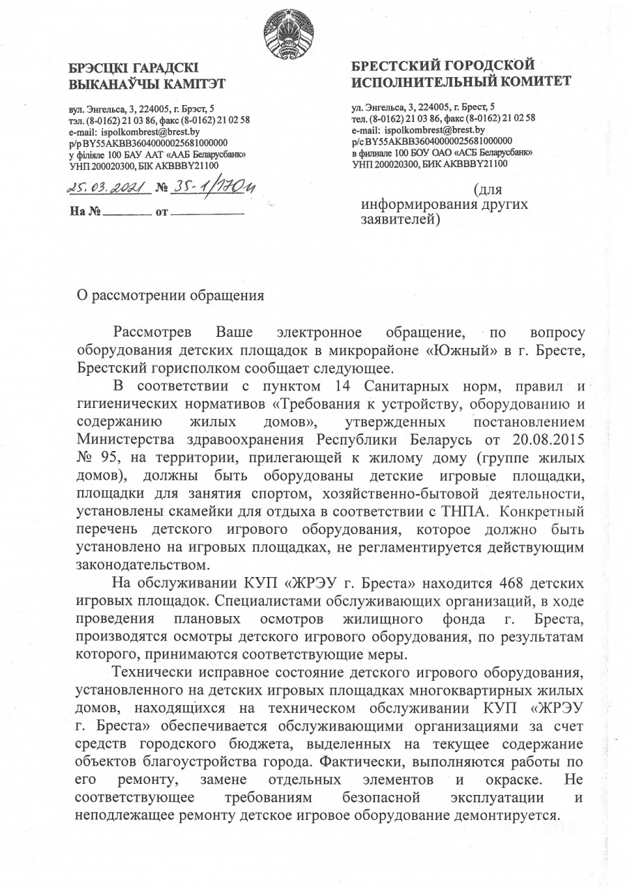 На основании изложенного мы требуем для наших детей установить на замену качели, соответствующие всем требованиям безопасности, в том числе СТБ ЕН 1176-2-2006 «Оборудование детских игровых площадок. Часть 2. Дополнительные требования безопасности и методы испытаний качелей».