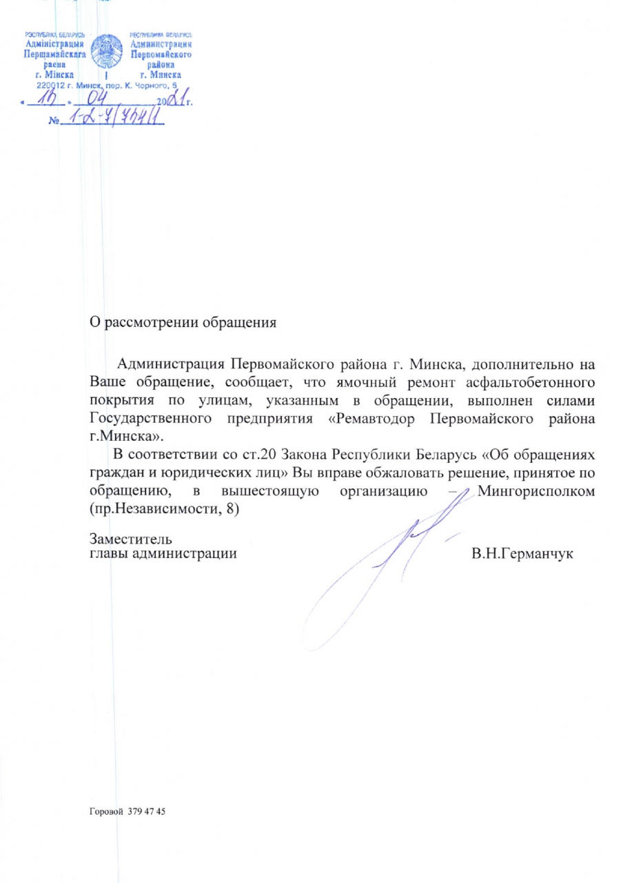 Ямочный ремонт асфальтобетонного покрытия по улицам, указанным в обращении, выполнен силами ГП "Ремавтодор Первомайского района г.Минска".