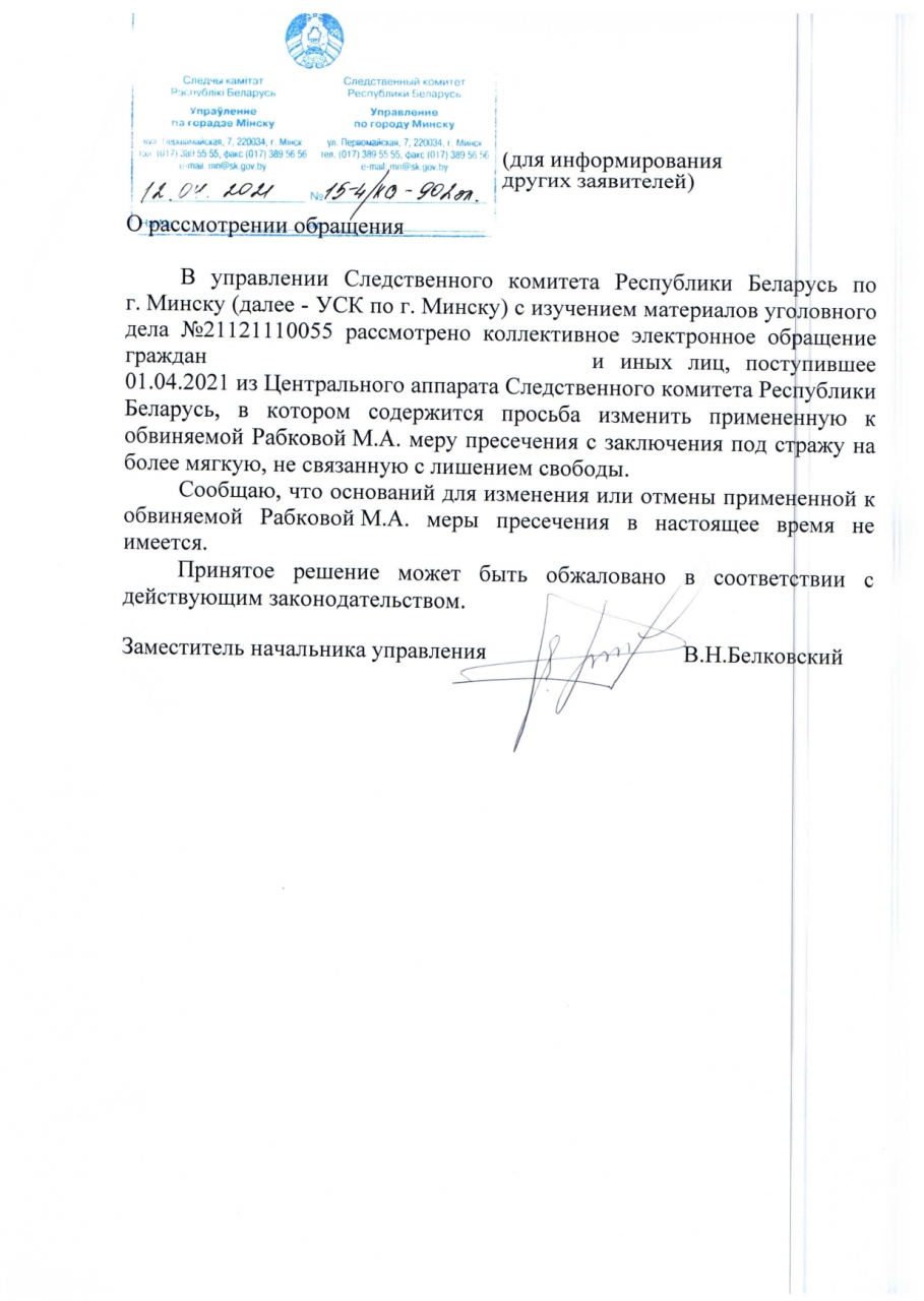 Поэтому мы, нижеподписавшиеся, просим на время расследования по делу Рабковой Марфы изменить ей меру пресечения наказания в силу утраты опасности деяния, согласно ст. 87 Уголовного кодекса.