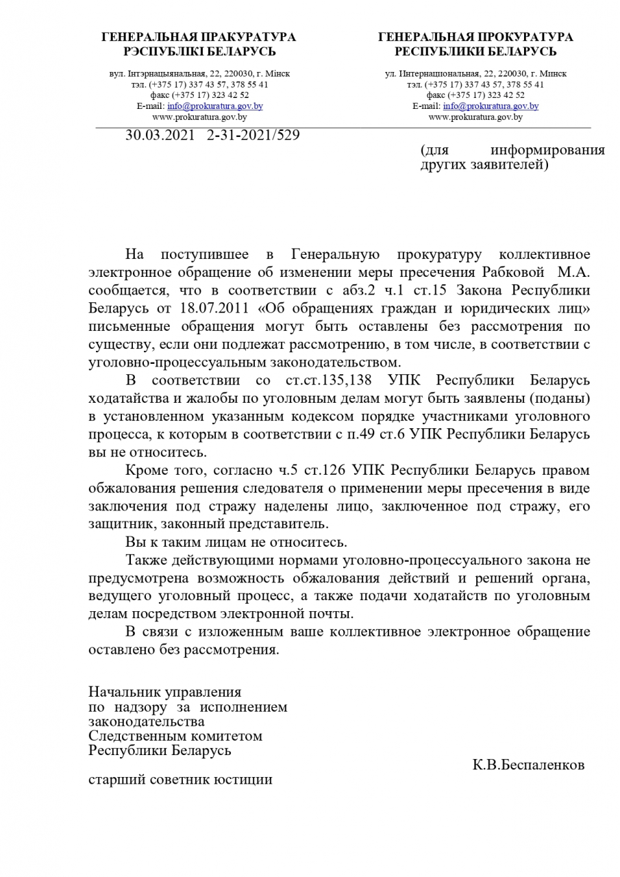 Позже, как нам стало известно, Марфе Рабковой предъявлено обвинение по ч.3 ст. 130 УК (разжигание расовой, национальной, религиозной либо иной социальной вражды или розни) и ч.2 ст.285 УК (создание преступной организации либо участие в ней).