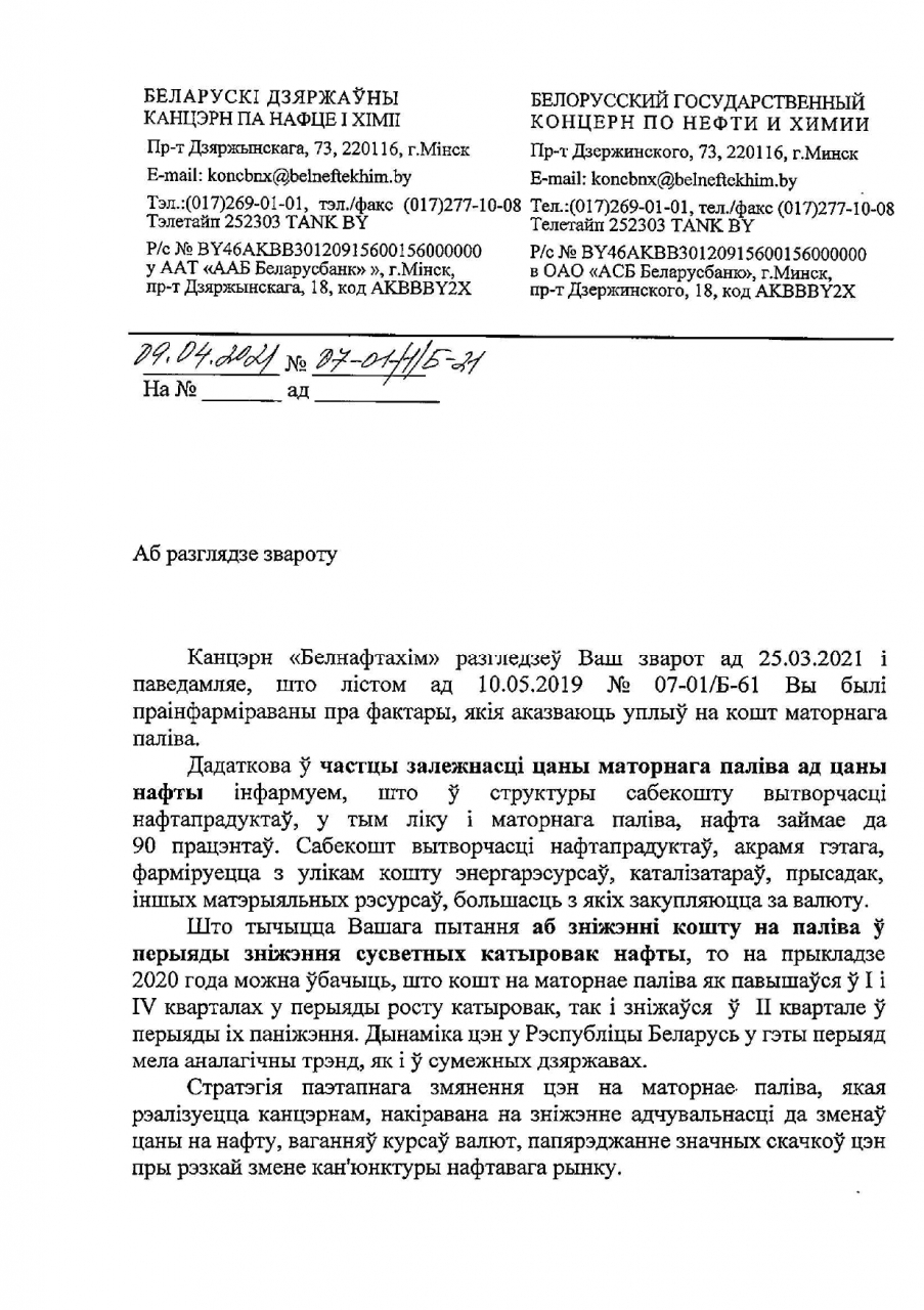 Сыходзячы з гэтага патрабуем даць абгрунтаваны адказ аб сапраўдных прычынах павышэння цаны на паліва.