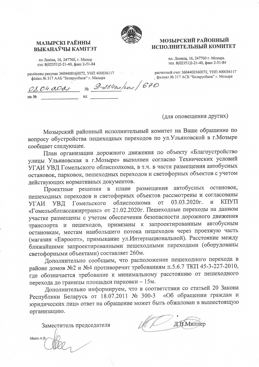 Руководствуясь ст.41, ст.45 Закона «О местном управлении и самоуправлении», которые устанавливают, что исполкомы организуют строительство, реконструкцию, ремонт и содержание местных автомобильных дорог, обеспечивают безопасность дорожного движения, а также пп.17.7 п.17 Положения о Государственной автомобильной инспекции Министерства внутренних дел Республики Беларусь, который определяет, что одной из основных функций ГАИ является изучение условий дорожного движения, принятие мер к совершенствованию организации движения транспорта и пешеходов, согласование в установленном порядке проектов организации дорожного движения в городах и на дорогах, требуем организовать пешеходный переход через дорогу по улице Ульяновской от магазина "Аметист" к домам №4 и №2 на Ульяновской улице. Место его установки отмечено на карте (приложение 2).