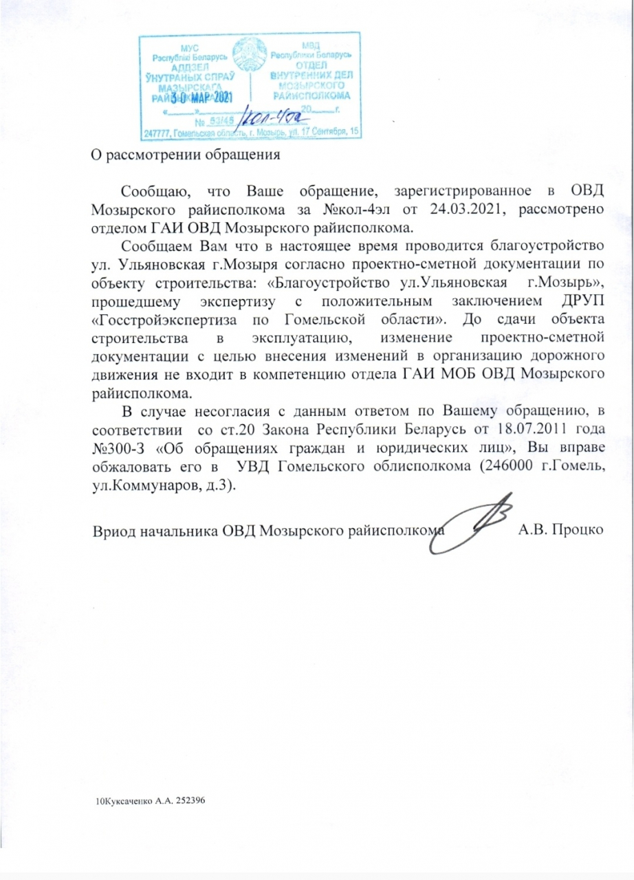 В настоящее время проводится благоустройство ул. Ульяновской. До сдачи объекта в эксплуатацию этот вопрос не входит в компетенцию Мозырского РОВД