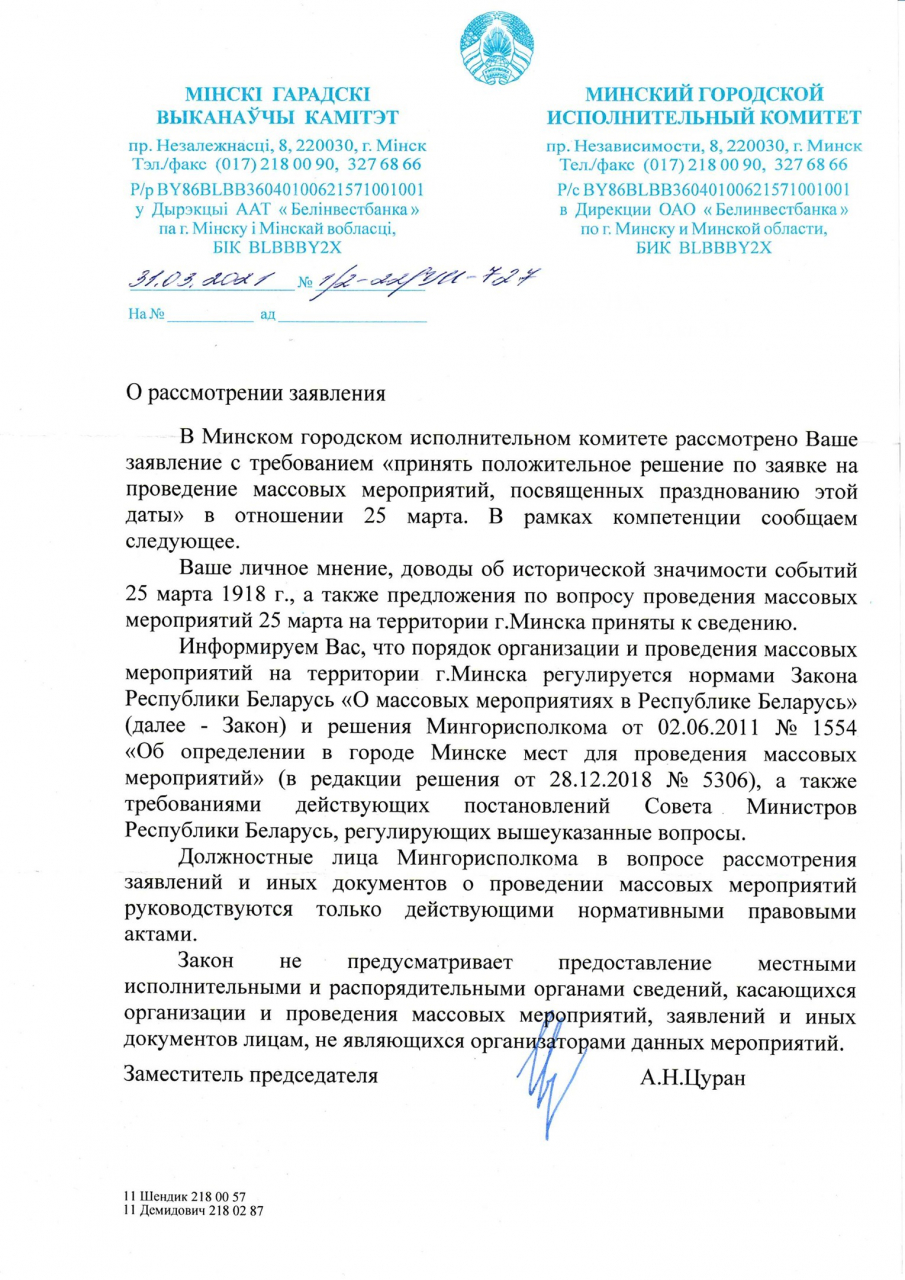 Сегодня многие известные нам учёные и политики в большинстве своём сходятся во мнении, что без БНР не было бы и сегодняшней независимой Республики Беларусь. В преддверии 103 годовщины образования БНР, пользуясь правом на свободу собраний, митингов, уличных шествий, демонстраций и пикетирований, гарантированным статьёй 35 Конституции Республики Беларусь, требуем принять положительное решение по заявке на проведение массовых мероприятий, посвященных празднованию этой даты. Считаем, что запрет на проведение массовых мероприятий, посвящённых этому событию, в условиях напряжённой общественно-политической ситуации в стране может привести к стихийным мероприятиям, нарушению правопорядка и созданию неудобств жителям и гостям Минска. Кроме этого, полагаем, что запрет на проведение мероприятий приведёт к необходимости усиления режима охраны правопорядка во всём городе, что повлечёт за собой значительные траты бюджетного финансирования. Учитывая, что в настоящий момент в Республике Беларусь отсутствует запрет на проведение массовых мероприятий по причине эпидемиологической ситуации с COVID, о чём свидетельствует проведение VI всебелорусского народного собрания (11-12 февраля 2021 г.), Минской лыжни-2021 (13 марта 2021 г.), а также проведение других менее масштабных мероприятий, требуем обеспечить реализацию конституционных прав на проведение митинга, посвященного дню образования БНР и обеспечить охрану правопорядка данного мероприятия. Нам известно, что движение “Рух за свободу” и другие подали заявку на проведение марша и шествия. Мы требуем, чтобы эта заявка была удовлетворена и гражданам не препятствовали провести мероприятие в честь важной для страны даты объявления независимости БНР.