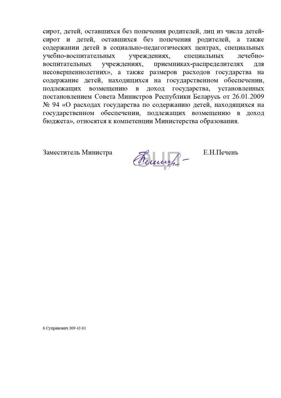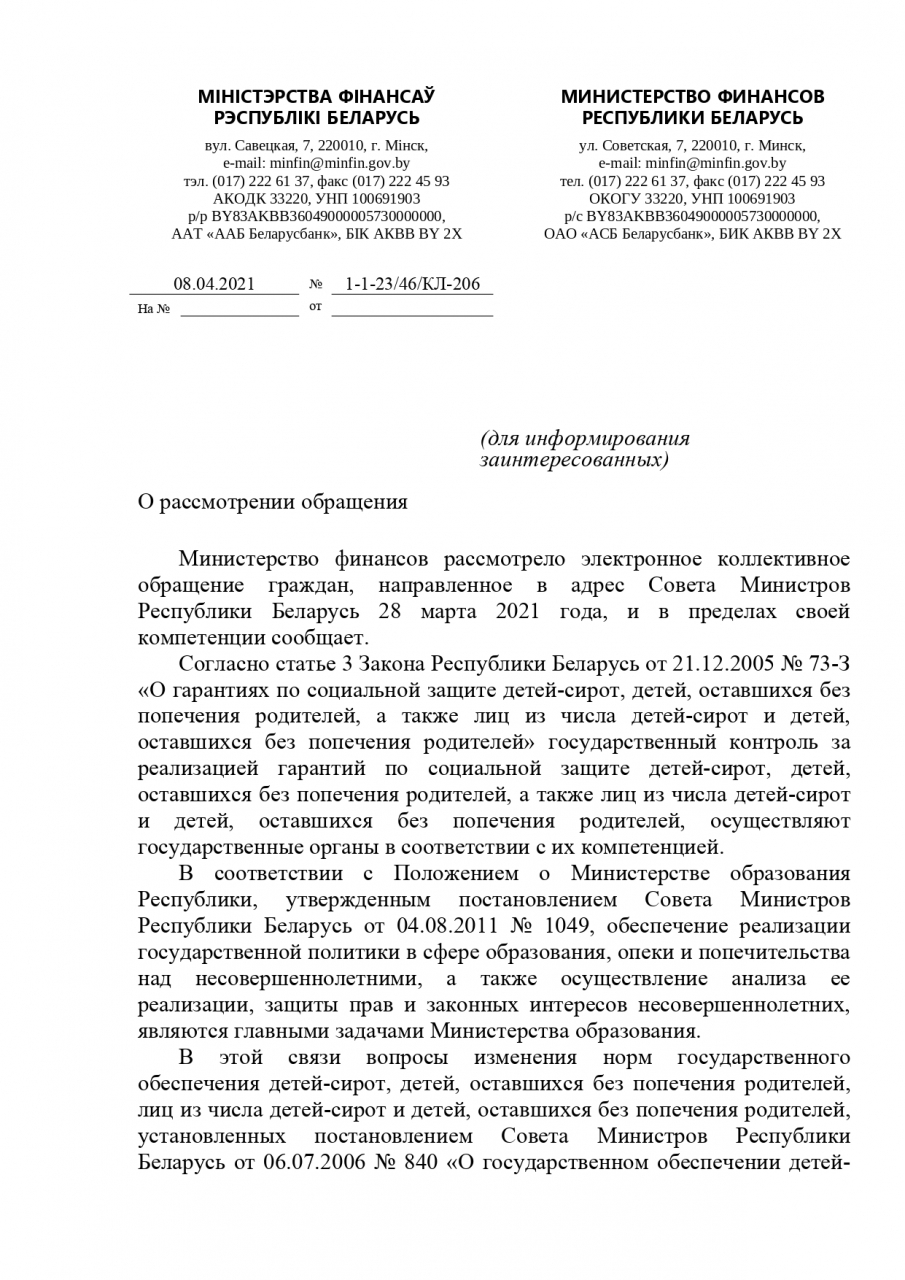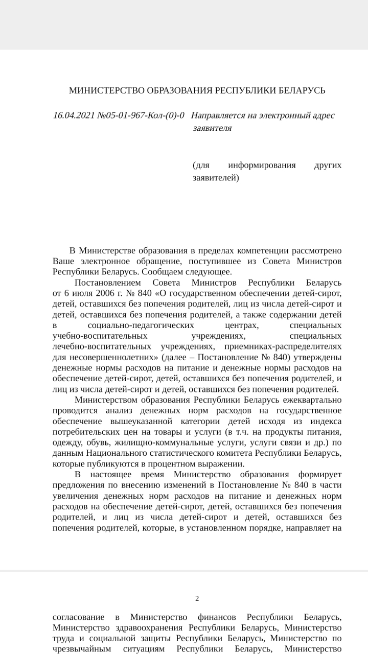 Поэтому просим Министерство образования Республики Беларусь совместно с Министерством финансов Республики Беларусь внести предложения по изменению(повышению) норм расходов на государственное обеспечение детей-сирот и детей, оставшихся без попечения родителей в Правительство Республики Беларусь, а Правительство внести изменения по повышению норм расходов на государственное обеспечение детей-сирот и детей, оставшихся без попечения родителей в постановление.