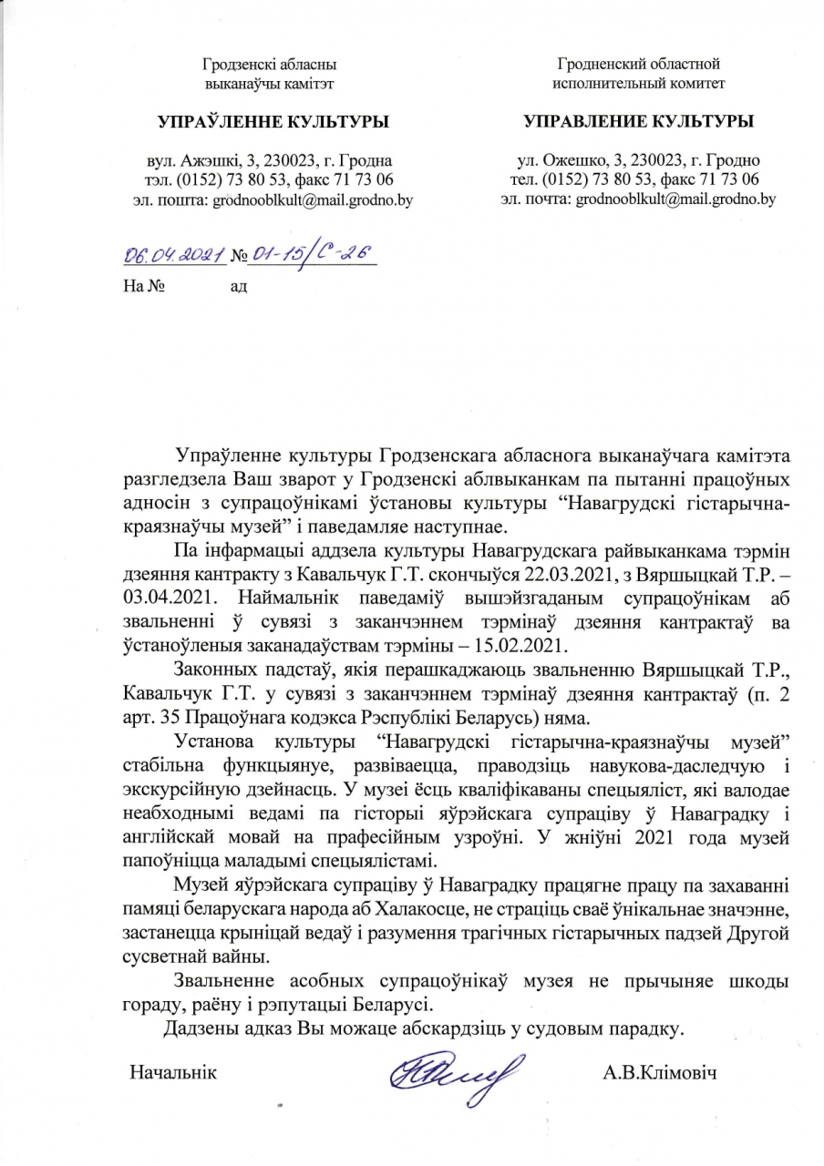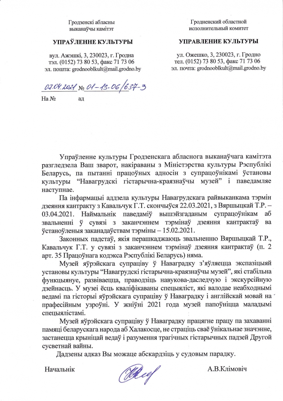 Мяркуем, што кантракты беспадстаўна не працягнуты пад ціскам аддзела культуры Навагрудскага выканкама, у абыход інтарэсаў горада і раёна, інтарэсаў Музея краязнаўчага, Музея яўрэйскага супраціву, жадання калектыву, у тым ліку кіраўніцтва музея.
