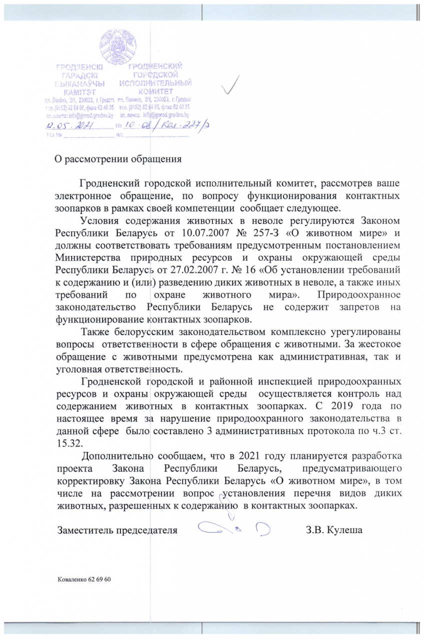 Природоохранное законодательство Республики Беларусь не содержит запретов на функционирование контактных зоопарков. Гродненской городской и районной инспекцией природоохранных ресурсов и охраны окружающей среды осуществляется контроль над содержанием животных и в контактных зоопарках.