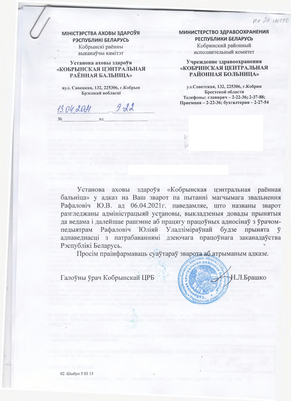 Выкладзеныя ў звароце довады прынятыя да ведама, далейшае рашэнне аб працягу працоўных адносінаў з урачом-педыятрам Ю.У.Рафаловіч будзе прынята ў адпаведнасці з патрабаваннямі дзеючага заканадаўства Рэспублікі Беларусь.