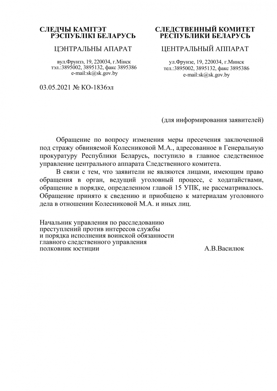 Мы, нижеподписавшиеся, просим на время расследования по делу С.Тихановского и М.Колесниковой изменить им меру пресечения в силу утраты опасности деяния, согласно ст. 87 Уголовного кодекса.