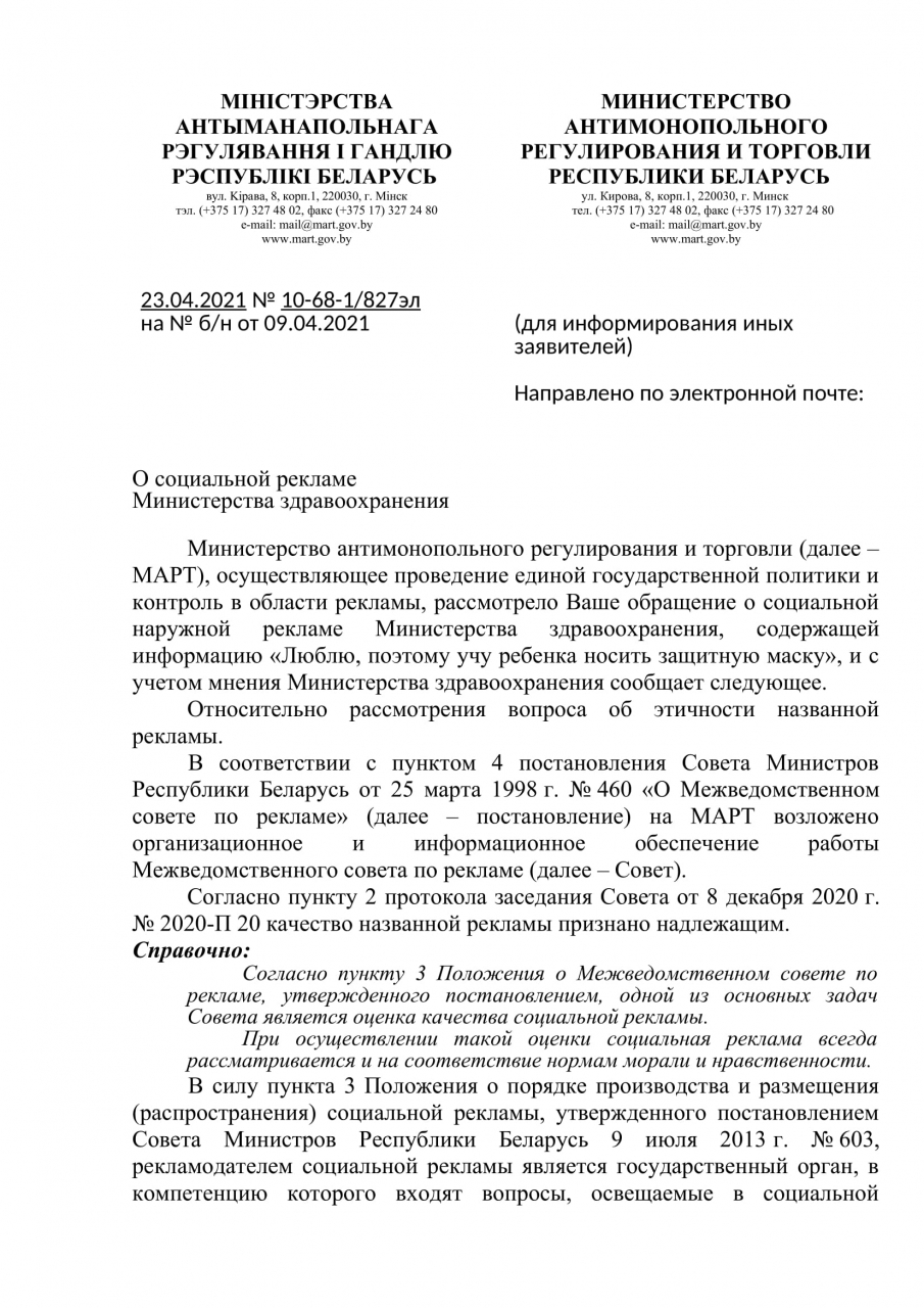 В социальной наружной рекламе Министерства здравоохранения «Люблю, поэтому учу ребёнка носить защитную маску» не усматриваются признаки нарушения требований Закона «О рекламе».
