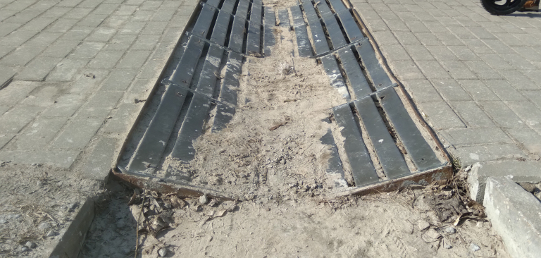 4) заменить решётку ливневой канализации в сквере. Данная решётка травмоопасна, она представляет препятствие как для обычных пешеходов так и для людей с ограниченными возможностями. А после дождя это ещё и водная преграда, так как вода стекает сверху решётки, а не под ней.