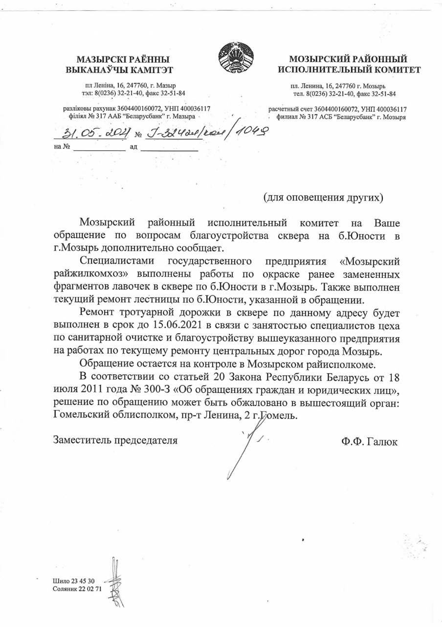1) провести работы по благоустройству территории и ремонту тротуарных плиток в сквере и возле него на подходе к ГУО "Ясли-сад №40 г.Мозыря". В том числе устранить провал плитки возле детского сада.