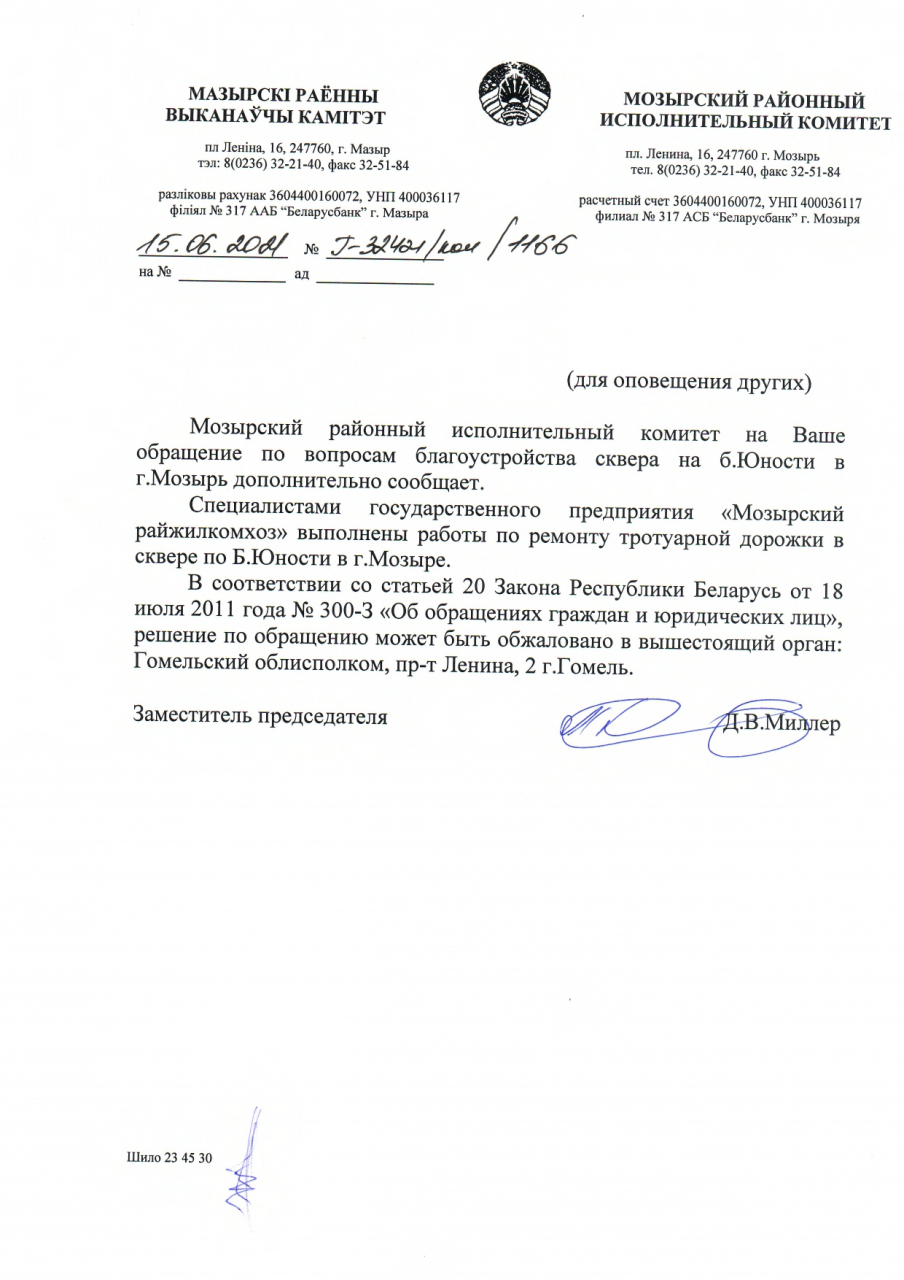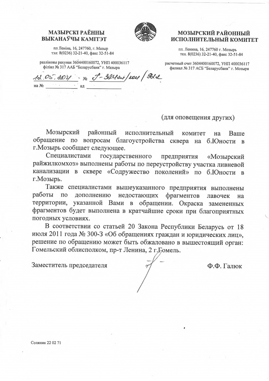 Руководствуясь ст.43 Закона «О местном управлении и самоуправлении в республике Беларусь», которая устанавливает, что исполкомы базового уровня в пределах своей компетенции обеспечивают благоустройство и озеленение на соответствующей территории, просим: