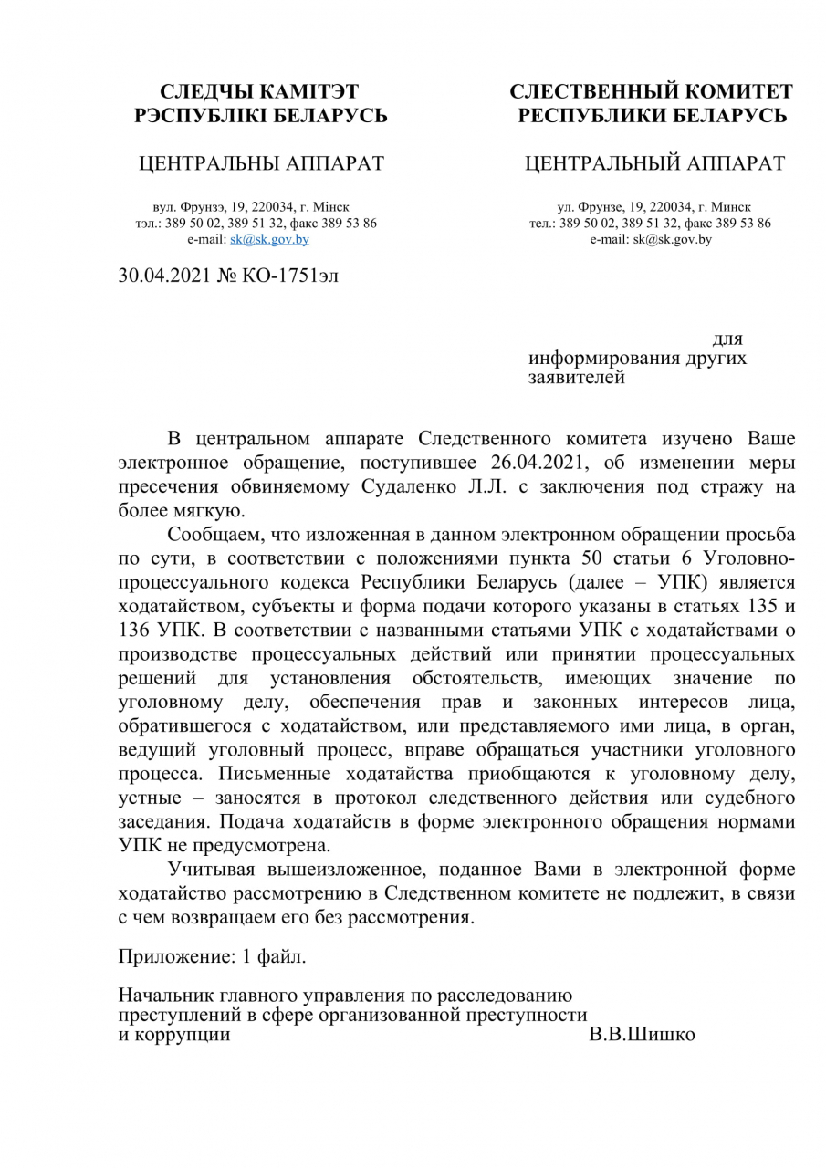 Пока Леониду Судаленко предъявлено обвинение, ведётся следствие, его вина не доказана. Также эпидемиологическая ситуация в стране неблагоприятная. Поэтому для нас очень важно, чтобы он мог находиться дома, рядом с семьёй, необходимо сделать всё возможное, чтобы Леонид Судаленко не стал заложником политической ситуации в стране.