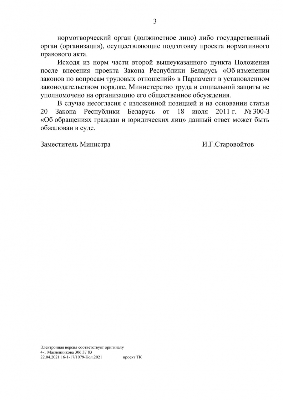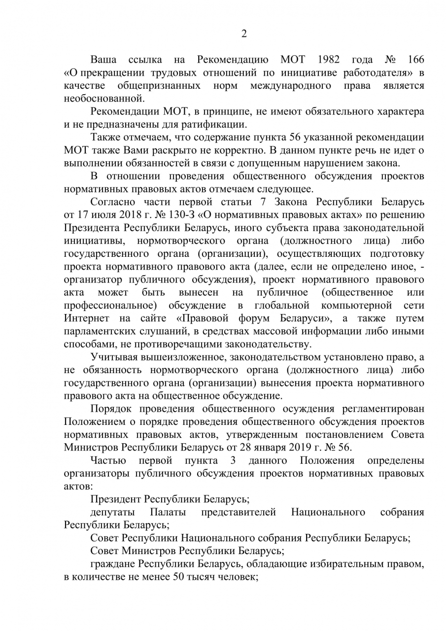 от Министерства труда и социальной защиты – провести общественное обсуждение проекта Закона «Об изменении законов» (по вопросам трудовых отношений) в соответствии с требованиями статьи 7 Закона Республики Беларусь от 17.07.2018 № 130-З «О нормативных правовых актах» и Положения о порядке проведения публичного обсуждения проектов нормативных правовых актов, утв. постановлением Совета Министров Республики Беларусь 28.01.2019 № 56 – на сайте «Правовой форум Беларуси», путем парламентских слушаний (с допуском всех заинтересованных лиц) или в средствах массовой информации.
