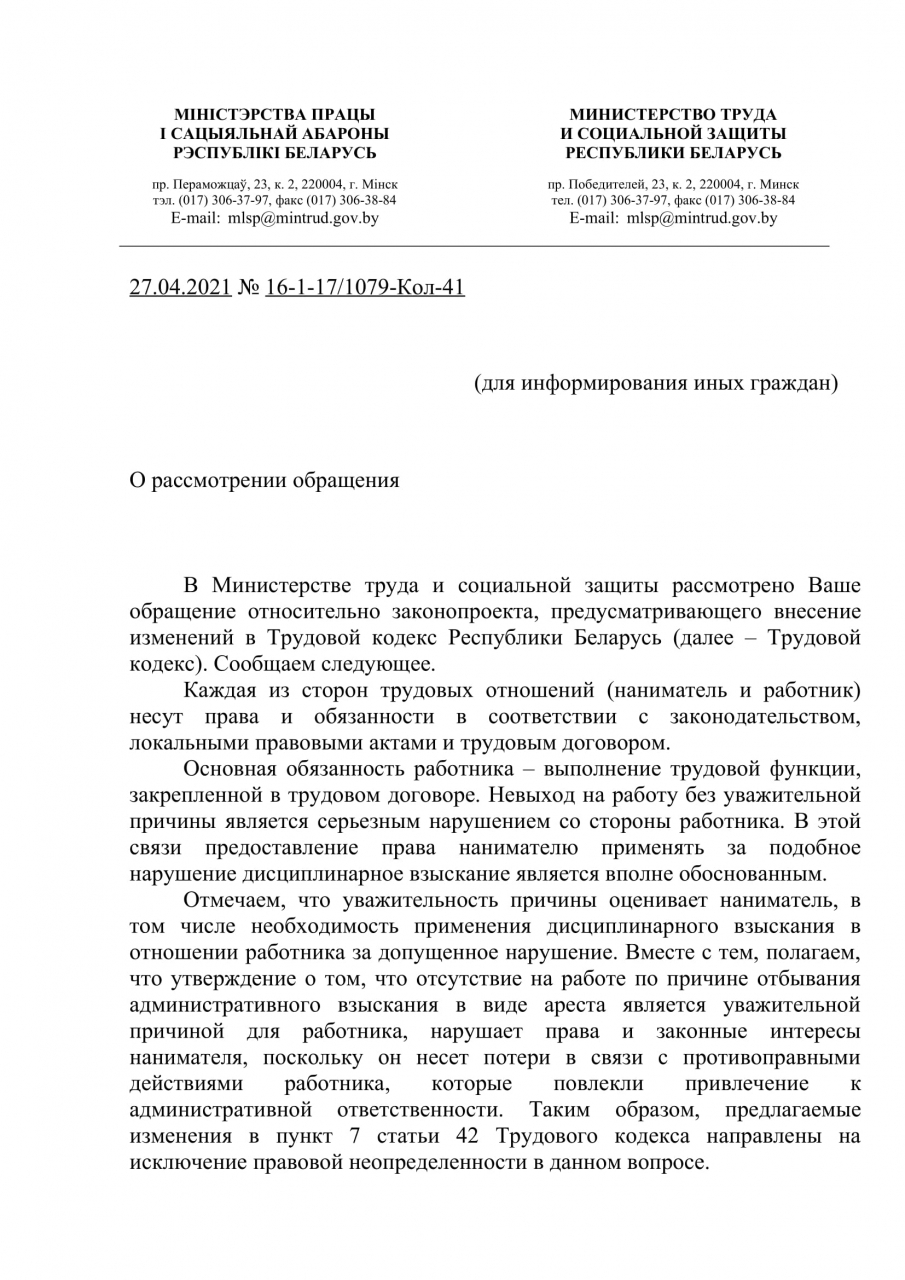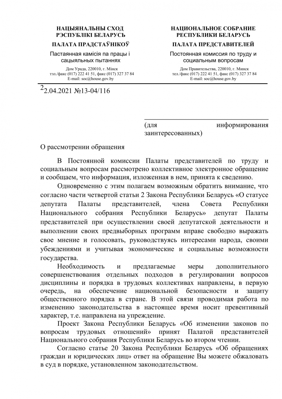 31 марта 2021 года в Палату представителей Национального собрания Республики Беларусь поступил проект Закона «Об изменении законов» (по вопросам трудовых отношений) (https://pravo.by/document/?guid=3951&p0=2021009001 )