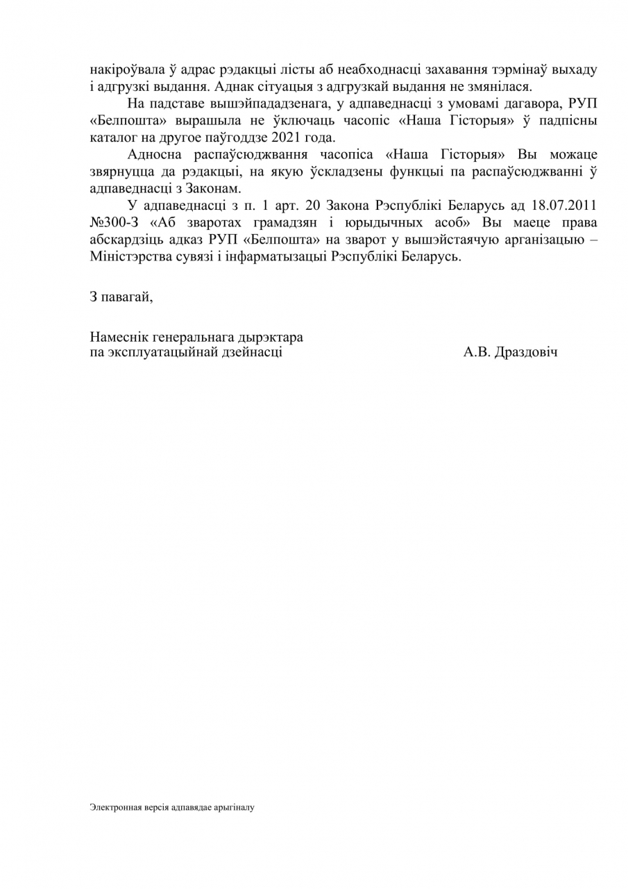 У адпаведнасці з умовамі дагавора, РУП «Белпошта» вырашыла не ўключаць часопіс «Наша Гiсторыя» ў падпісны каталог на другое паўгоддзе 2021 года на падставе невыканання рэдакцыяй "Нашай гісторыі" сваіх абавязацельстваў належным чынам.