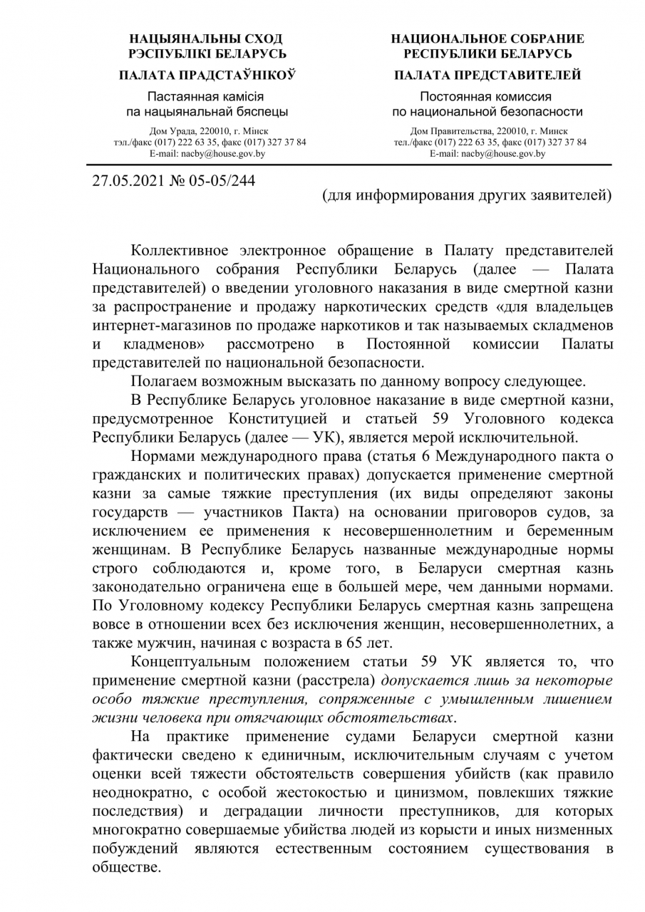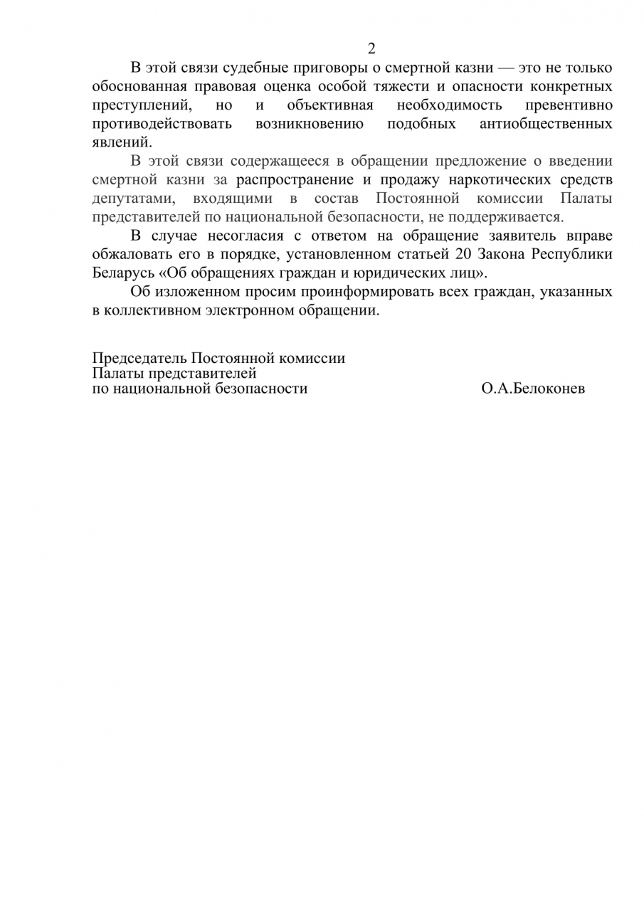 Содержащееся в обращении предложение о введении смертной казни за распространение и продажу наркотических средств депутатами, входящими в состав Постоянной комиссии Палаты представителей по национальной безопасности, не поддерживается.