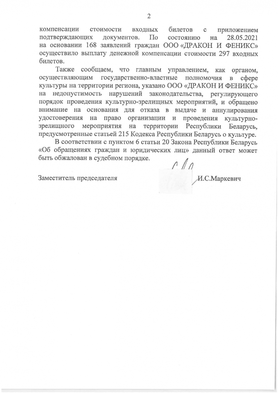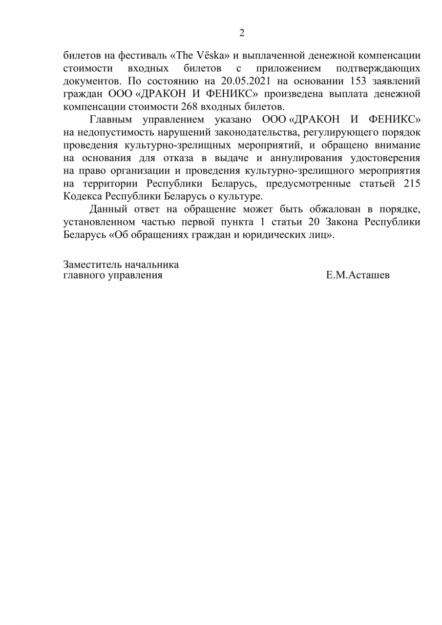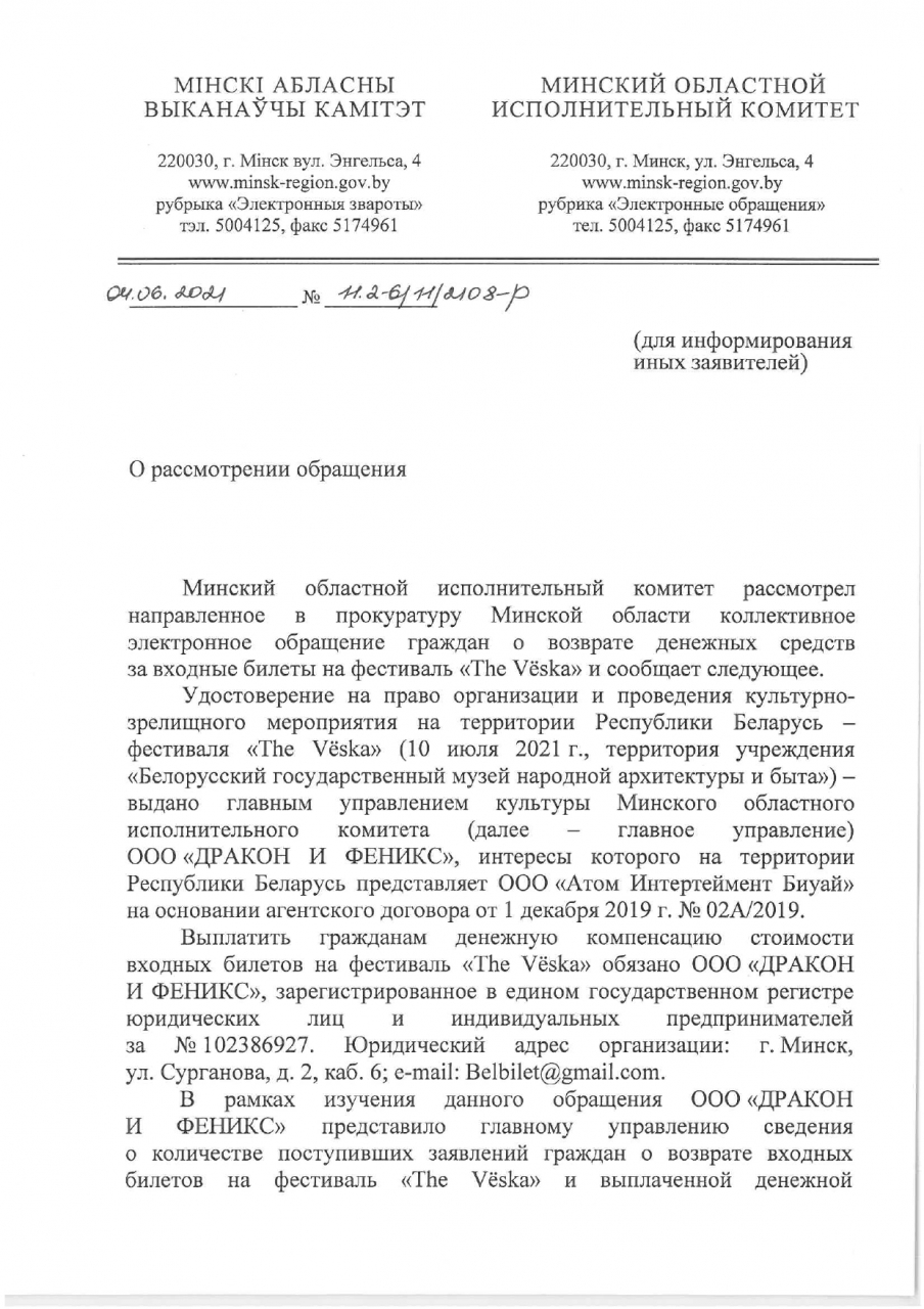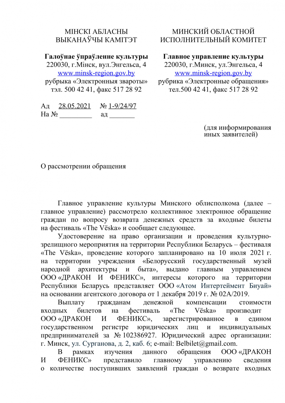- пояснить, какой из организаций – ООО «Атом Интертеймент Биуай» или ООО «ДРАКОН И ФЕНИКС» – выдано удостоверение на право организации и проведения культурно-зрелищного мероприятия на территории Республики Беларусь – фестиваль «The Vёska», который состоится 10 июля 2021 года (согласно статье 214 Кодекса о культуре)?