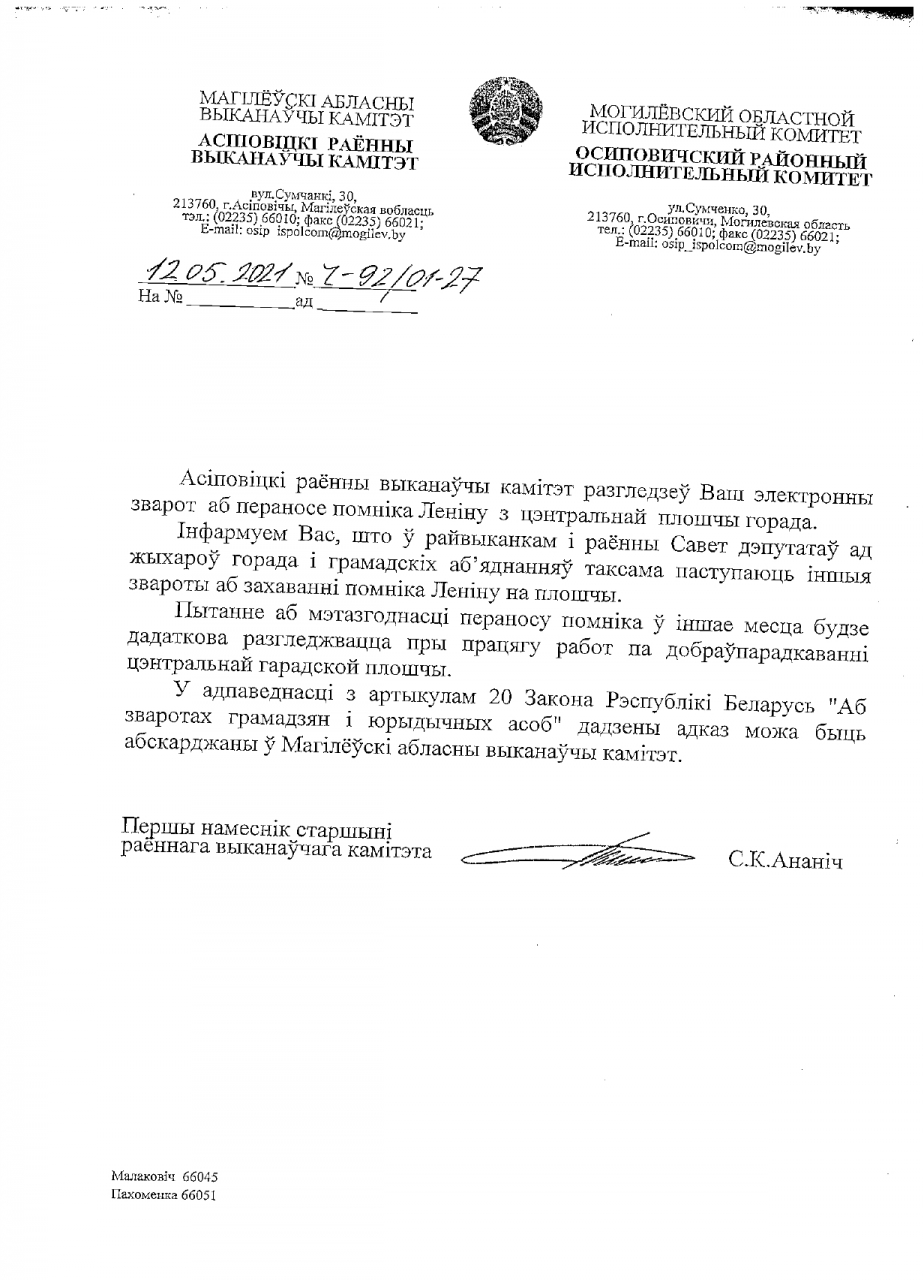 Пасля вырубкі дрэваў на Цэнтральнай плошчы горада Асіповічы мы прапануем перанесці з гэтай плошчы помнік лідару Кастрычнікай рэвалюцыі 1917 года - Леніну У.І.