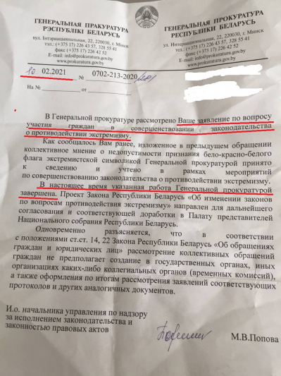 10 февраля 2021 года своим ответом №0702-213-2020/28, Генеральная прокуратура Республики Беларусь сообщила, что в настоящее время (на момент подготовки ответа), работа по совершенствованию законодательства о противодействии экстремизму в Генеральной прокуратуре завершена, а Проект Закона Республики Беларусь «Об изменении законов по вопросам противодействия экстремизму» направлен для дальнейшего согласования и соответствующей доработки в Палату представителей Национального собрания Республики Беларусь.