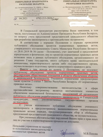 В ответ на жалобу (от 12.04.2021 года №0702-213-2020/679) Генеральная прокуратура Республики Беларусь сообщила, что проекты законов «О недопущении реабилитации нацизма» и «О противодействии экстремизму» относятся к обеспечению национальной безопасности, поэтому общественного обсуждения не требуют.