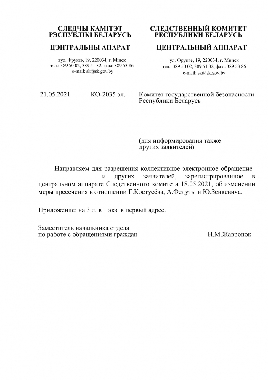 Поэтому мы, нижеподписавшиеся, требуем на время расследования по делу Г.Костусёва, А.Федуты и Ю.Зенкевича изменить им меру пресечения в силу утраты опасности деяния, согласно ст. 87 Уголовного кодекса.