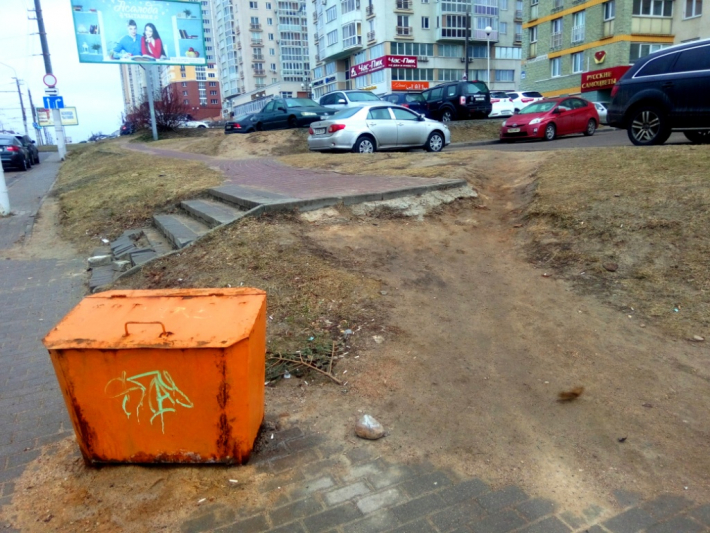 В Советском районе г.Минска возле перекрёстка улиц Н.Некрасова и М.Богдановича в 20 метрах от остановки общественного транспорта «Некрасова» имеется ступенчатый спуск к остановке.