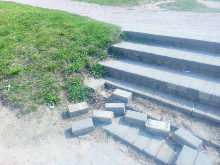 Ступать пешеходам на нижние ступеньки опасно, так как тротуарные плитки не скреплены между собой, а это может привести к получению пешеходами травм.
