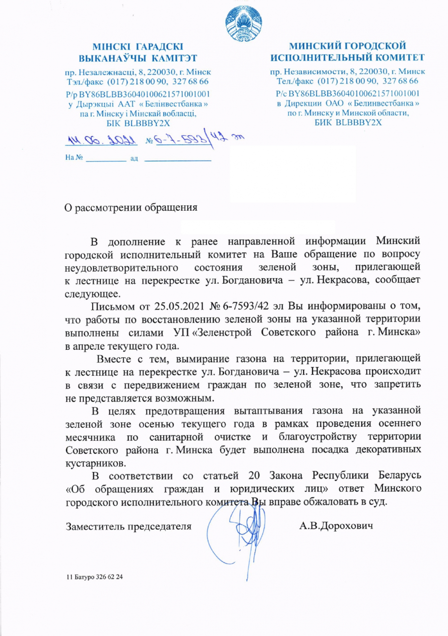 3 - поручить УП "Зеленстрой Советского района г. Минска" восстановить зелёную зону и плодородный слой почвы, чтобы избежать дальнейшей эрозии почвы,
