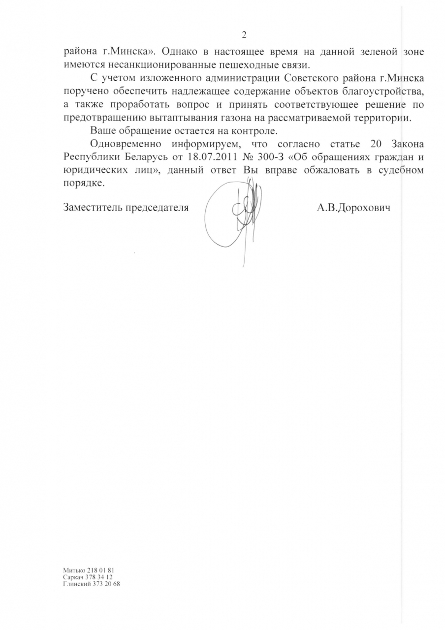 Администрации Советского района г.Минска поручено обеспечить надлежащее содержание объектов благоустройства, а также проработать вопрос и принять соответствующее решение по предотвращению вытаптывания газона на указанной в обращении территории.
