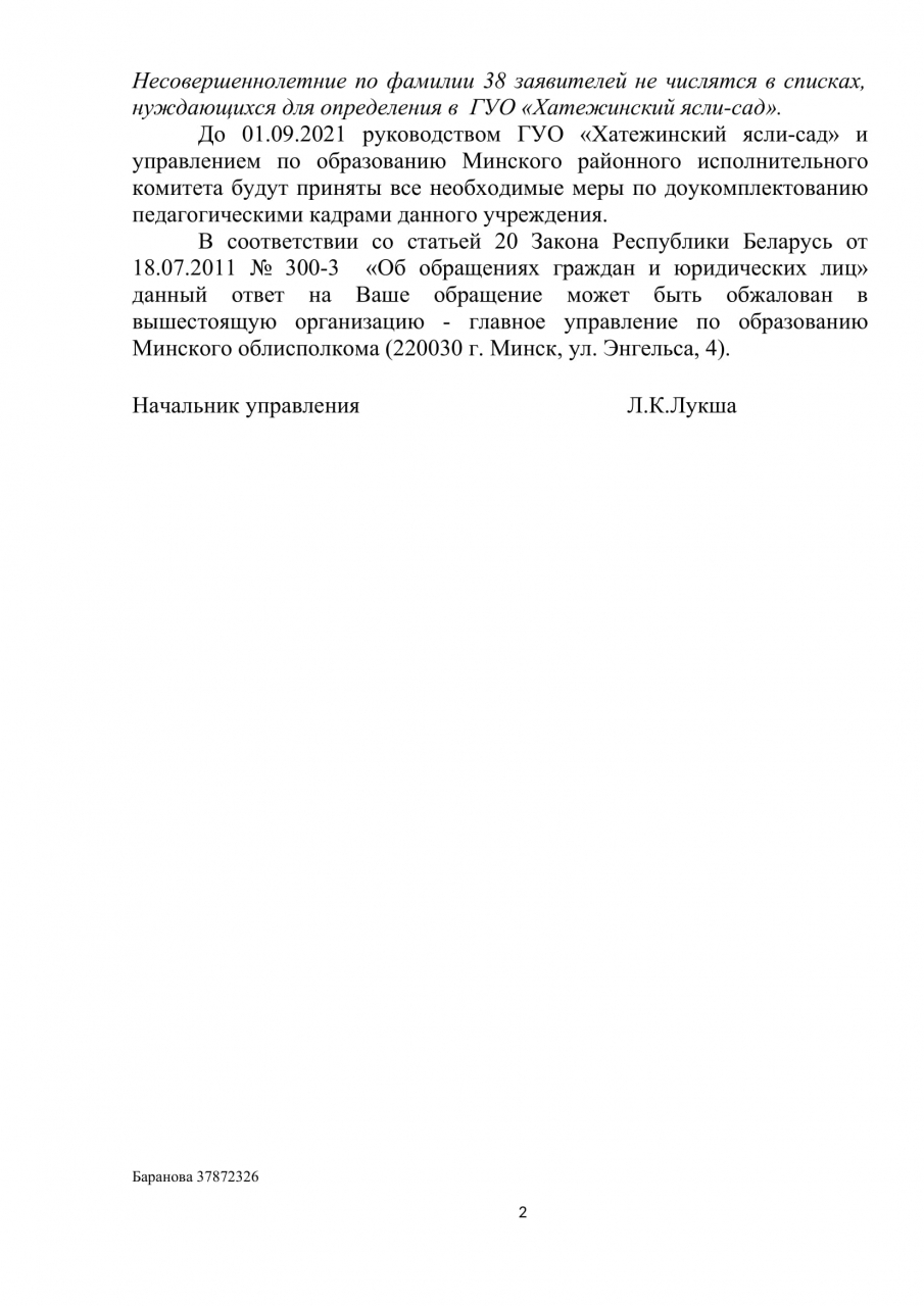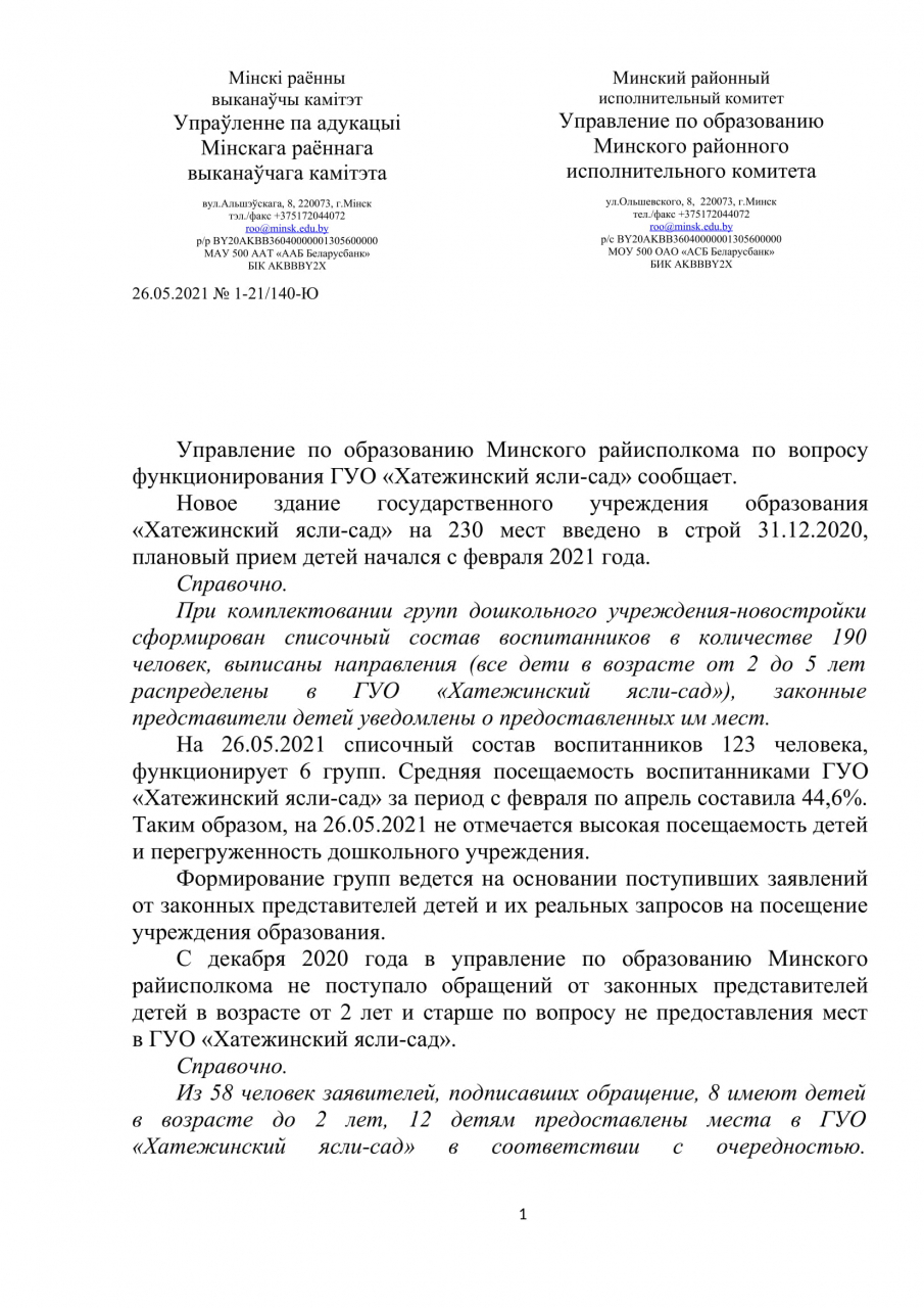 До 01.09.2021 руководством ГУО «Хатежинский ясли-сад» и управлением по образованию Минского районного исполнительного комитета будут приняты все необходимые меры по доукомплектованию педагогическими кадрами данного учреждения.