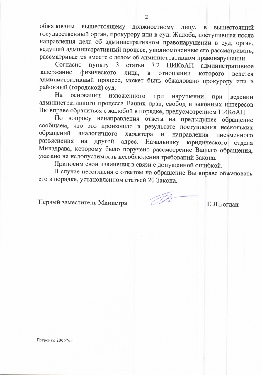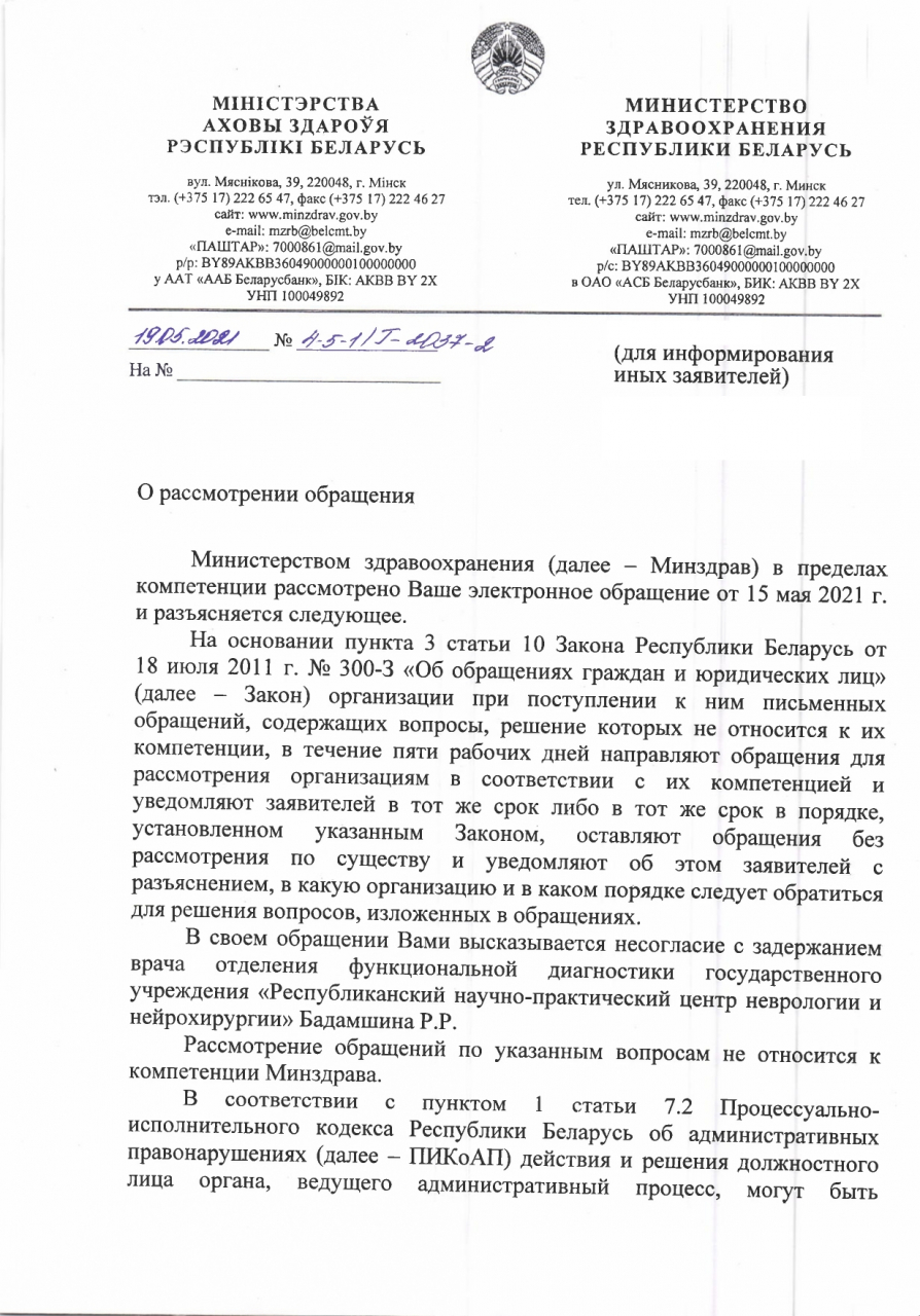 Рассмотрение обращений по вопросам, связанным с задержанием Р.Р.Бадамшина и ведением административного процесса, не относится к компетенции Минздрава.
