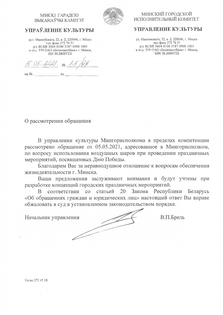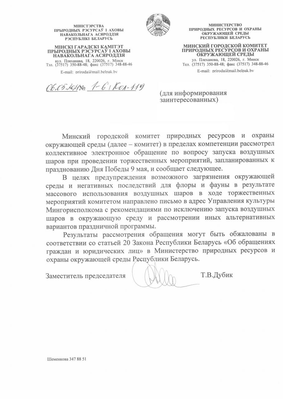 В адрес Управления культуры Мингорисполкома направлено письмо с рекомендациями по исключению запуска воздушных шаров в окружающую среду и рассмотрении иных альтернативных вариантов праздничной программы.