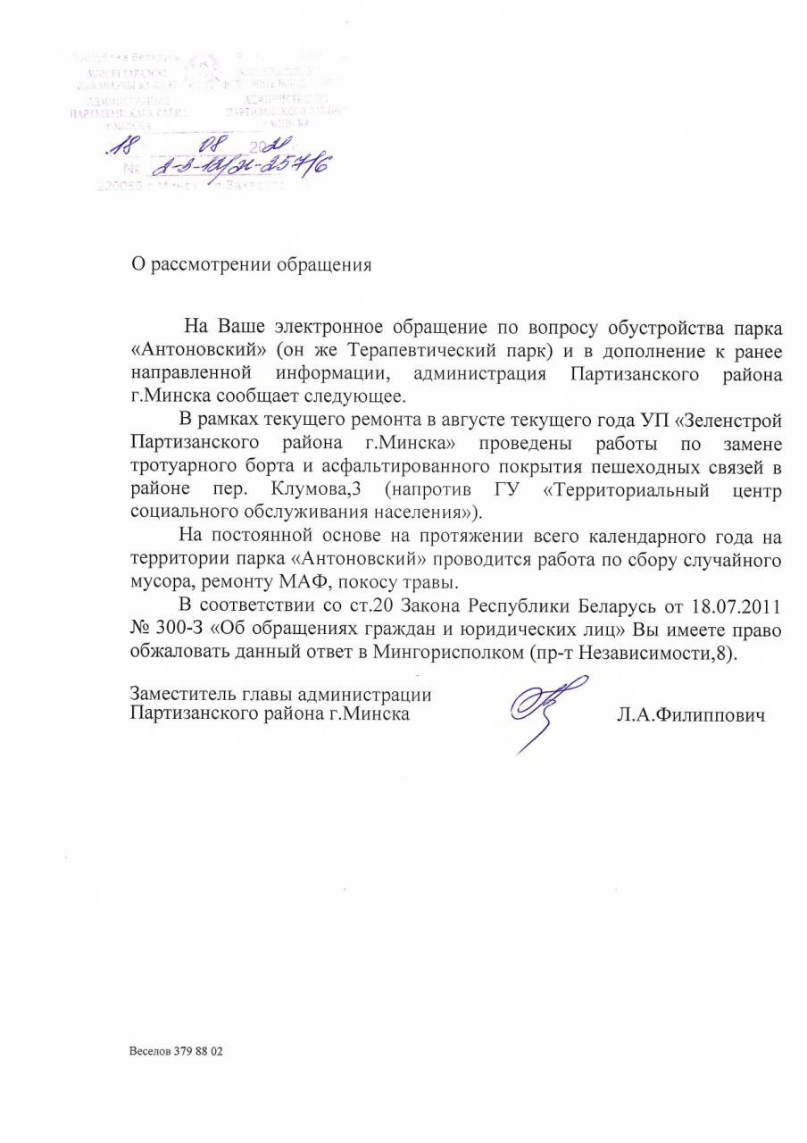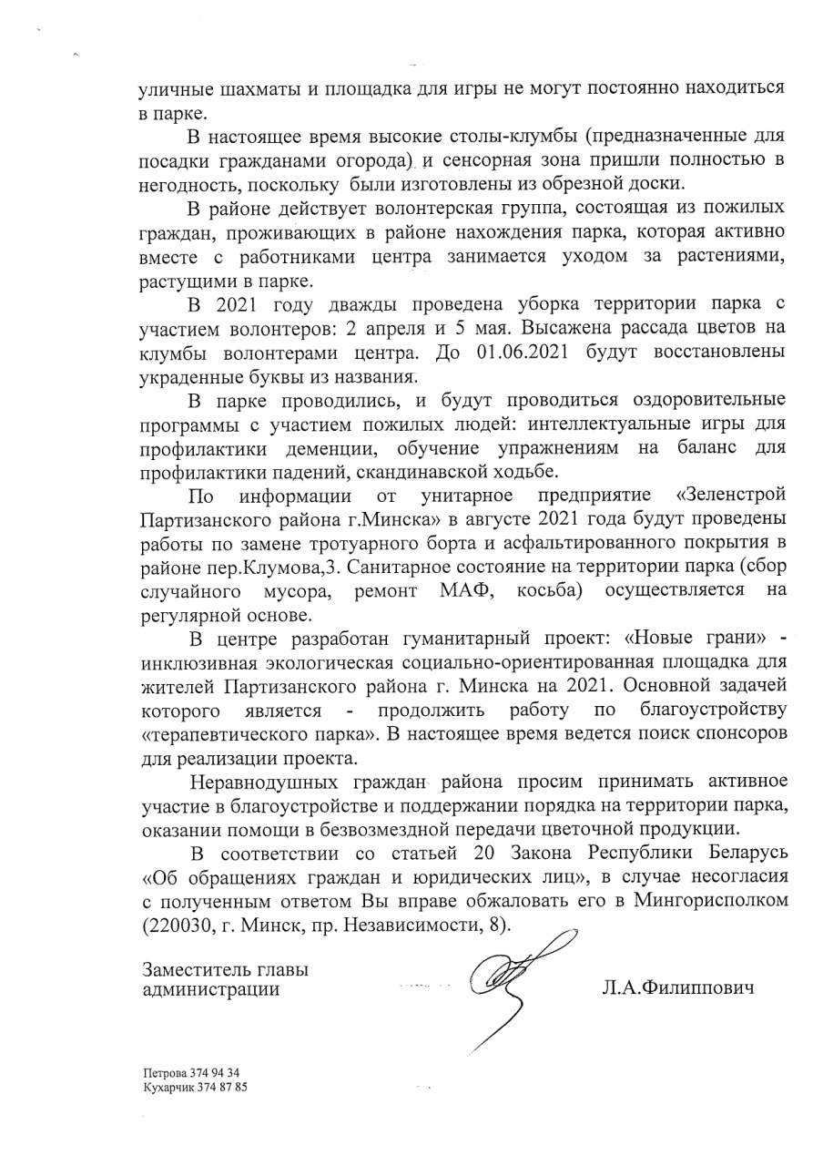 В связи с текущим состоянием парка мы, нижеподписавшиеся жители и гости Партизанского района г.Минска, требуем пояснить следующее: