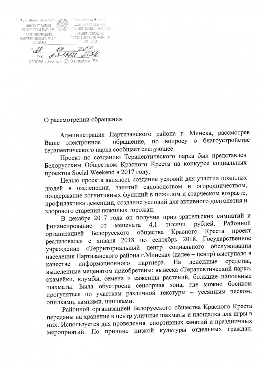 30 апреля в выпуске газеты «Минский курьер» на 12-й странице в рубрике «Социум» опубликовано интервью с директором центра соцобслуживания Татьяной Кухарчик «Нельзя сказать нет». В данной статье, среди прочего, указано, что в терапевтическом парке, расположенном в переулке Клумова в зелёной зоне, установлены скамейки, оборудована площадка для игры в уличные шахматы, обустроена сенсорная зона. Данный парк заложен в 2018 году, торжественное открытие освещено в крупнейших новостных порталах страны, ниже приведены ссылки на публикации и фотоматериалы из них: