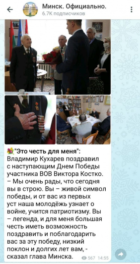 6 мая 2021 года в официальном телеграмм-канале Мингорисполкома "Минск. Официально" было опубликовано сообщение о посещении председателем Мингорисполкома В.Кухаревым участника ВОВ Виктора Костко (https://t.me/minskiygorispolkom/1029?single)