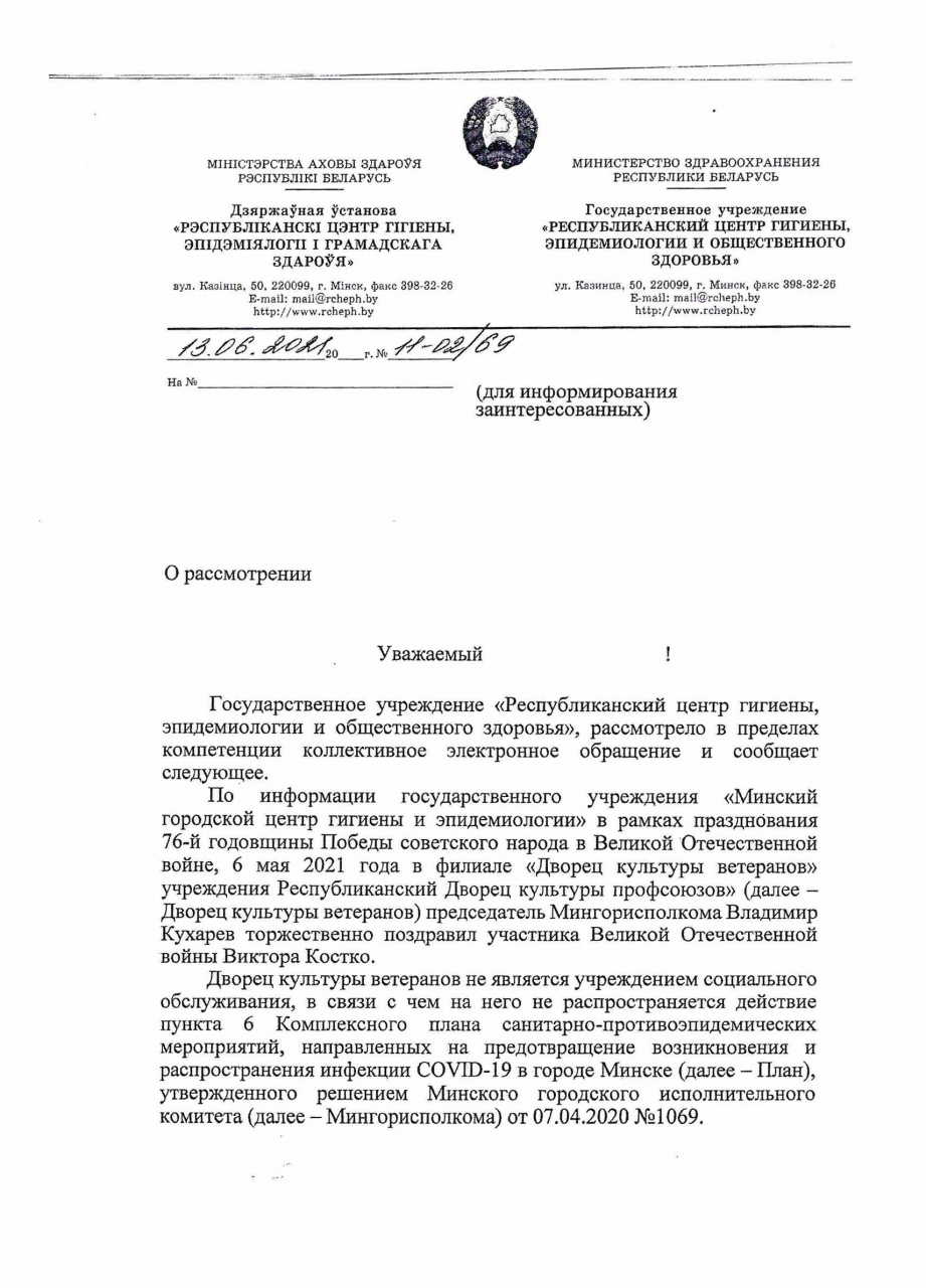 Посещение Дворца культуры профсоюзов, где проходила встреча председателя Минского горисполкома В.Кухарева с ветераном Великой Отечественной войны В.Костко происходила с соблюдением масочного режима (https://minsk.gov.by/ru/news/new/2021/05/06/944/).