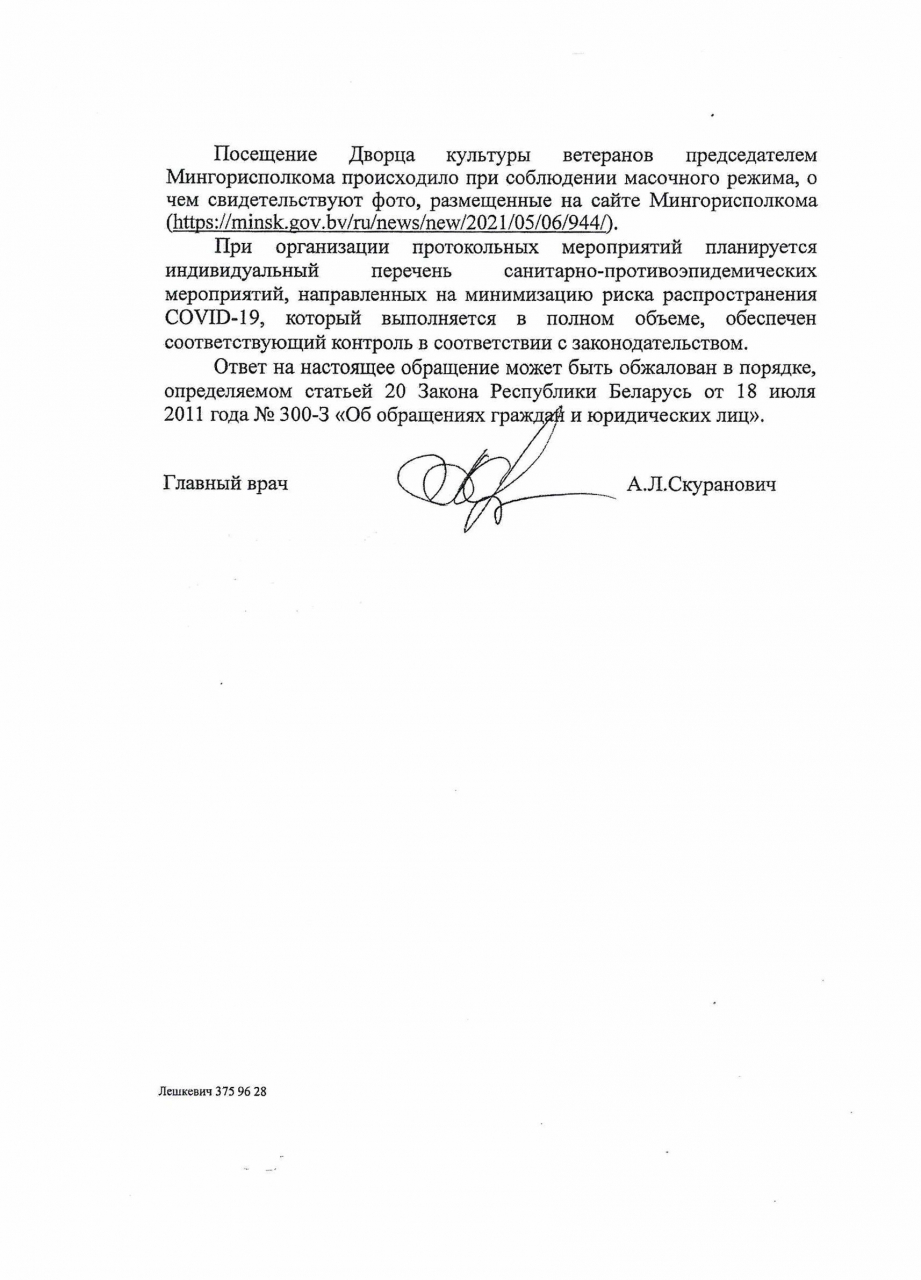 - своими действиями полностью проигнорировал План дополнительных мероприятий по профилактике и снижению распространения острых респираторных инфекций, в том числе вызванных COVID-19, в г. Минске (которым же и был утвержден Мингорисполкомом);