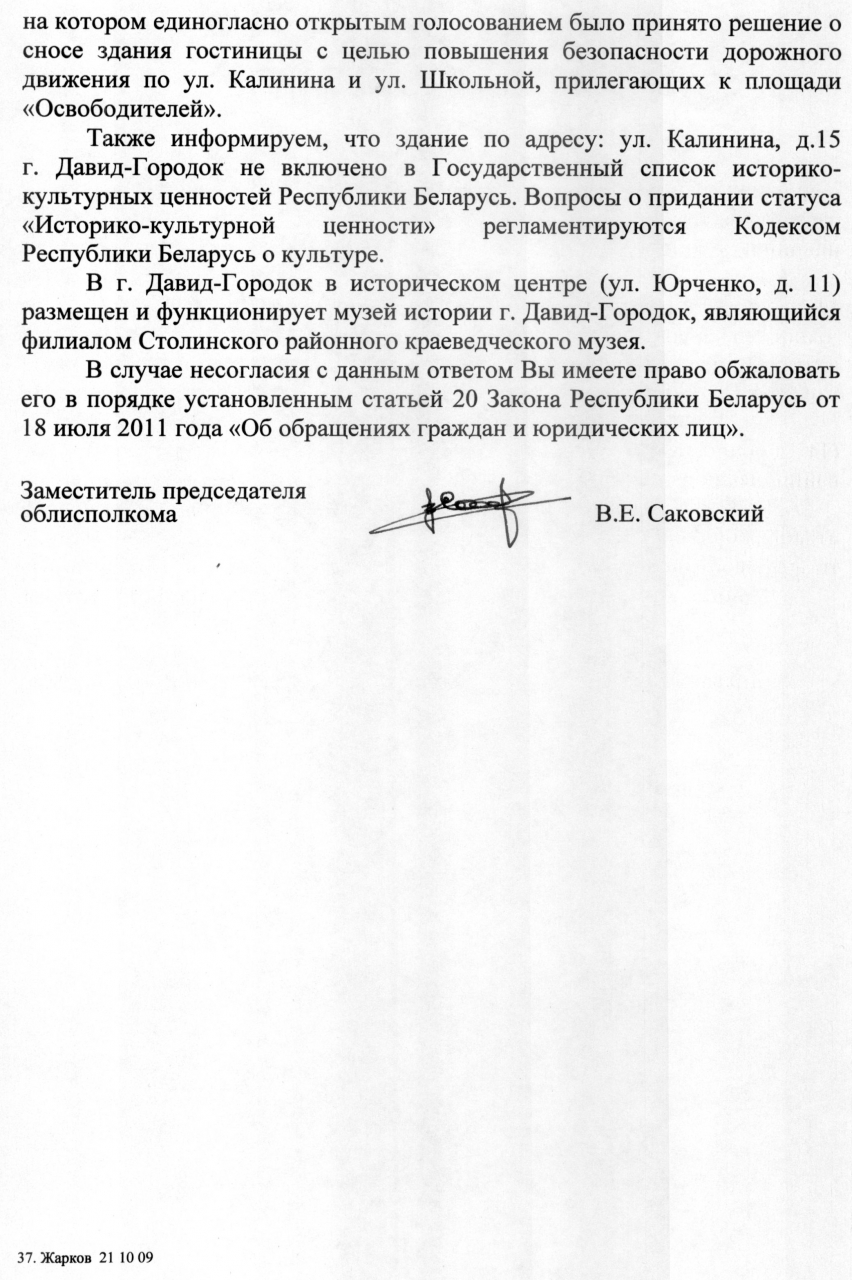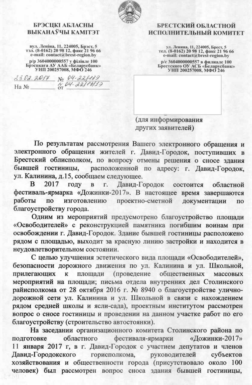 Мы, нижеподписавшиеся жители г. Давид- Городка Столинского района Брестской области, а также неравнодушные граждане Республики Беларусь, деятели науки, культуры и искусства Республики Беларусь, просим отменить решение о сносе здания бывшей гостиницы г. Давид- Городка, расположенного по ул. Калинина, 15.