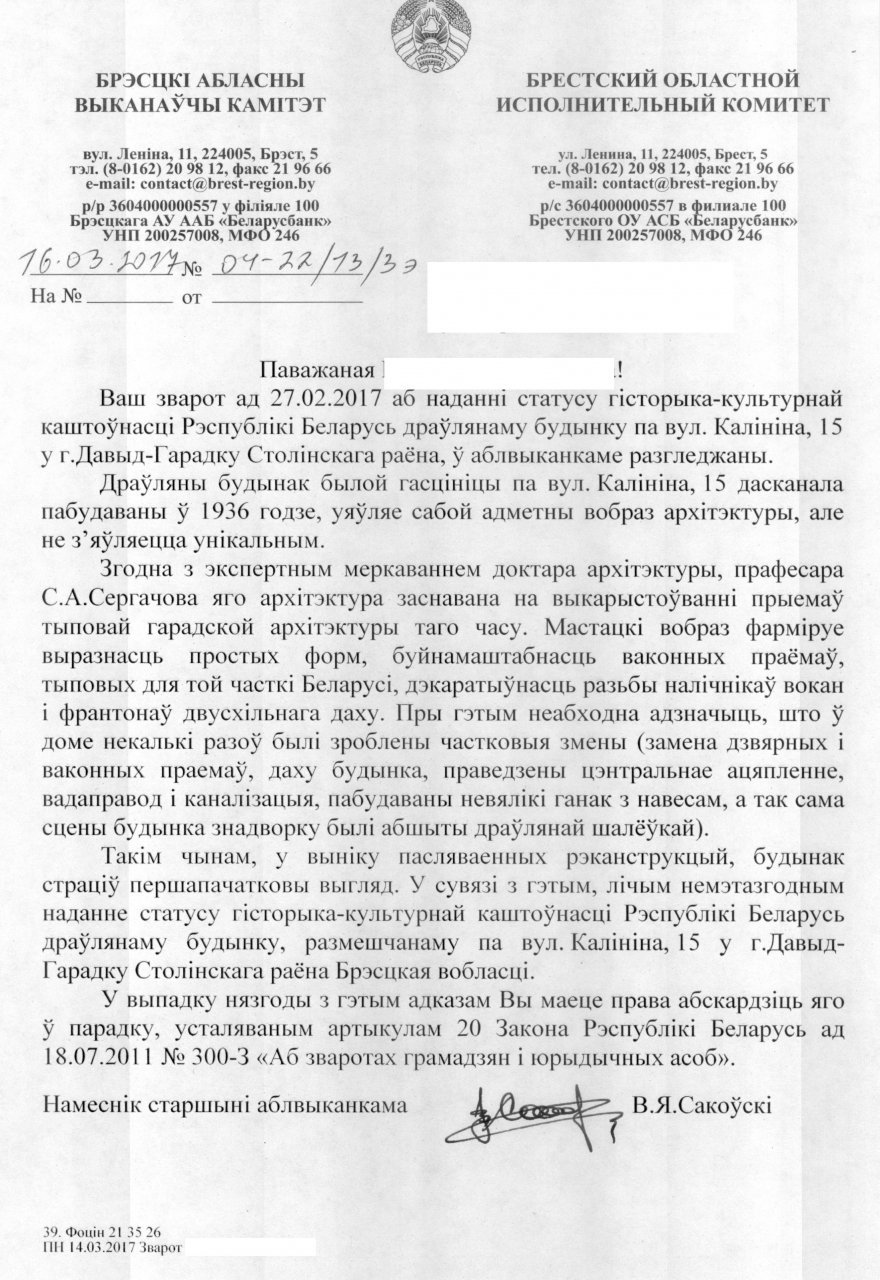 При принятии этого решения было проигнорировано предоставленное в Брестский облисполком мнение доктора архитектуры, профессора, заведующего кафедрой архитектуры жилых и общественных зданий БНТУ С.А. Сергачёва, 10 января 2017 г. награждённого премией Президента Республики Беларусь «За духовное возрождение».
