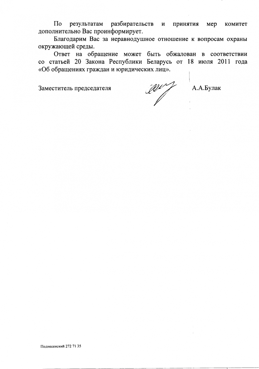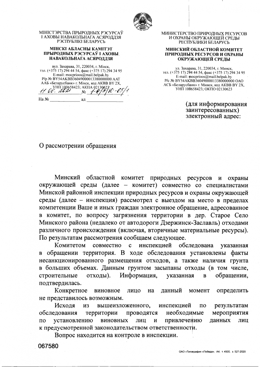 Минской районной инспекцией природных ресурсов и охраны окружающей среды по результатам обследования территории, указанной в обращении, проводятся необходимые мероприятия по установлению виновных лиц и привлечению их к ответственности, предусмотренной законодательством.